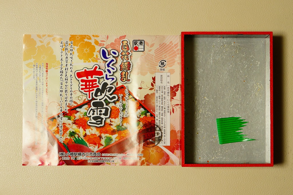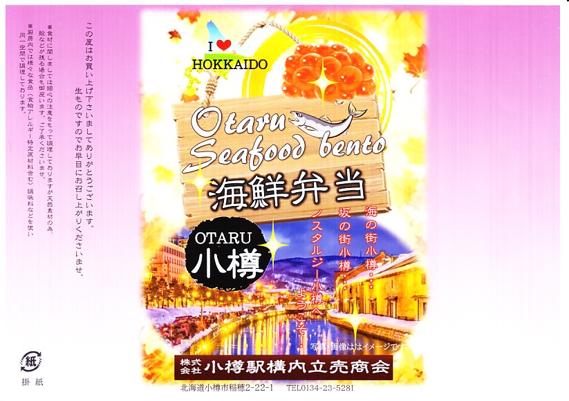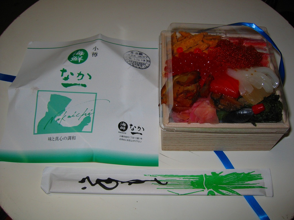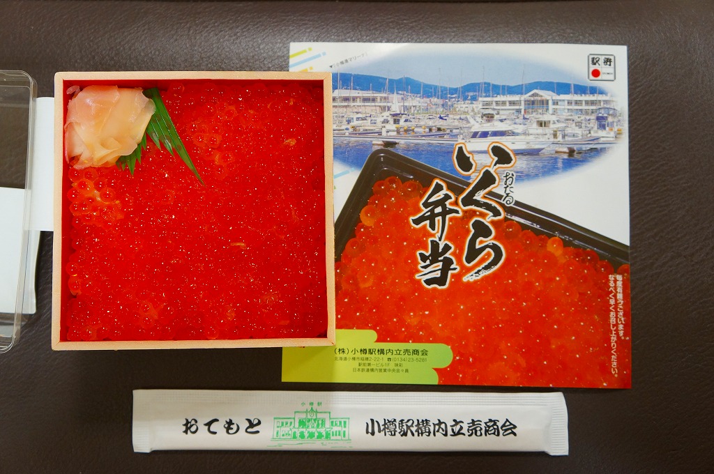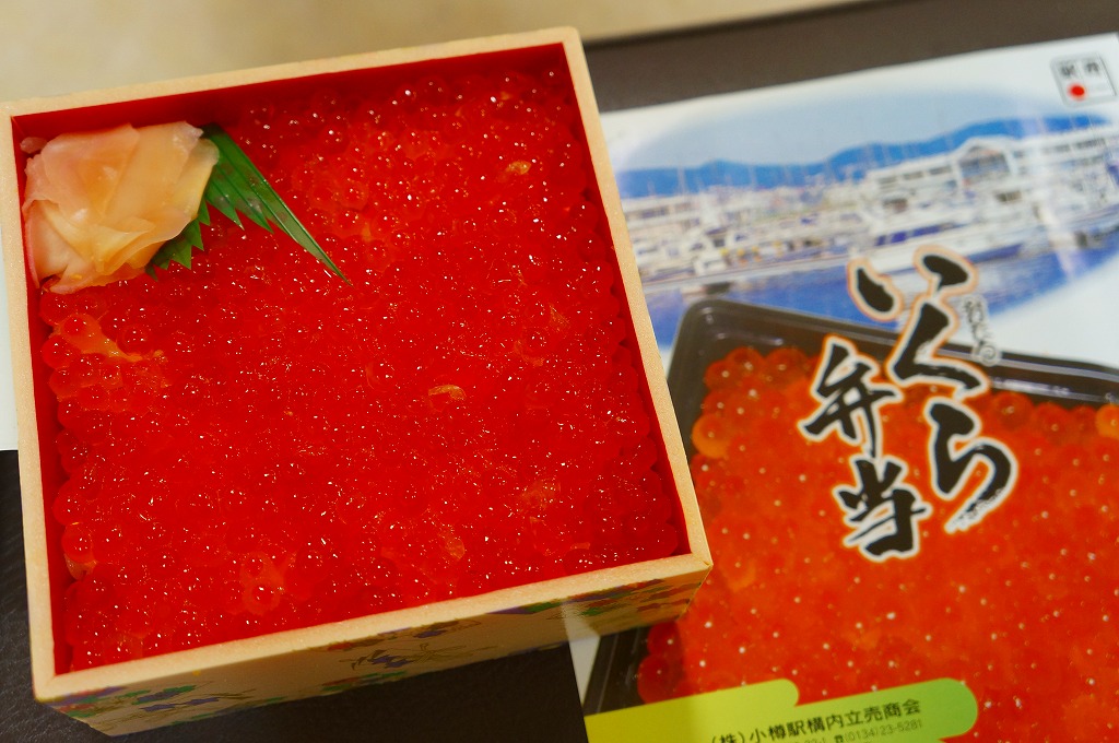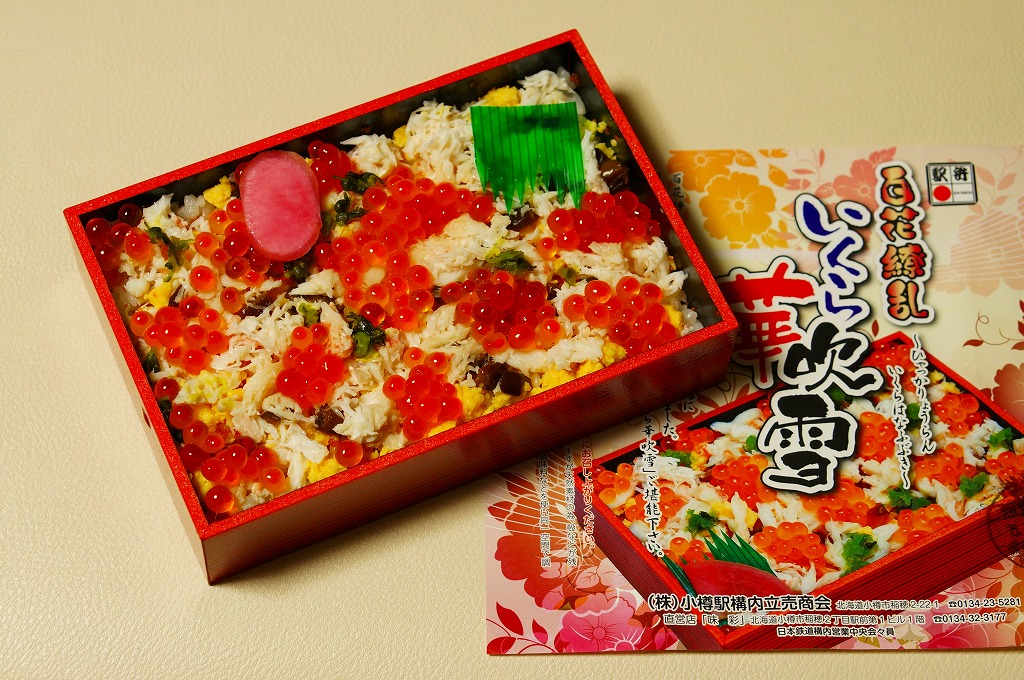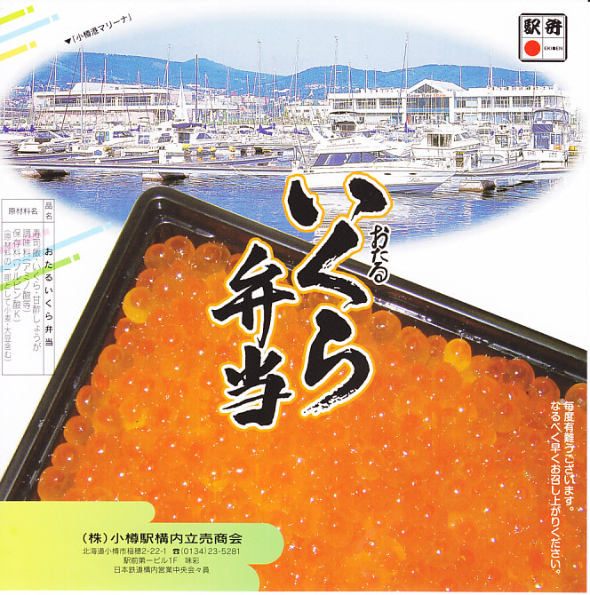 正方形の容器に、中身と小樽の町の写真を印刷した、容器をはみ出すくらい大きめの掛紙をかけて、割り箸とともに輪ゴムで留める。中身は掛紙と具の配置が異なるが素材は同じ、カズノコを和えたイカソーメンにイクラなどを御飯の上に載せたもの。なぜかこの駅弁にだけ、掛紙に駅弁マークが付いていない。