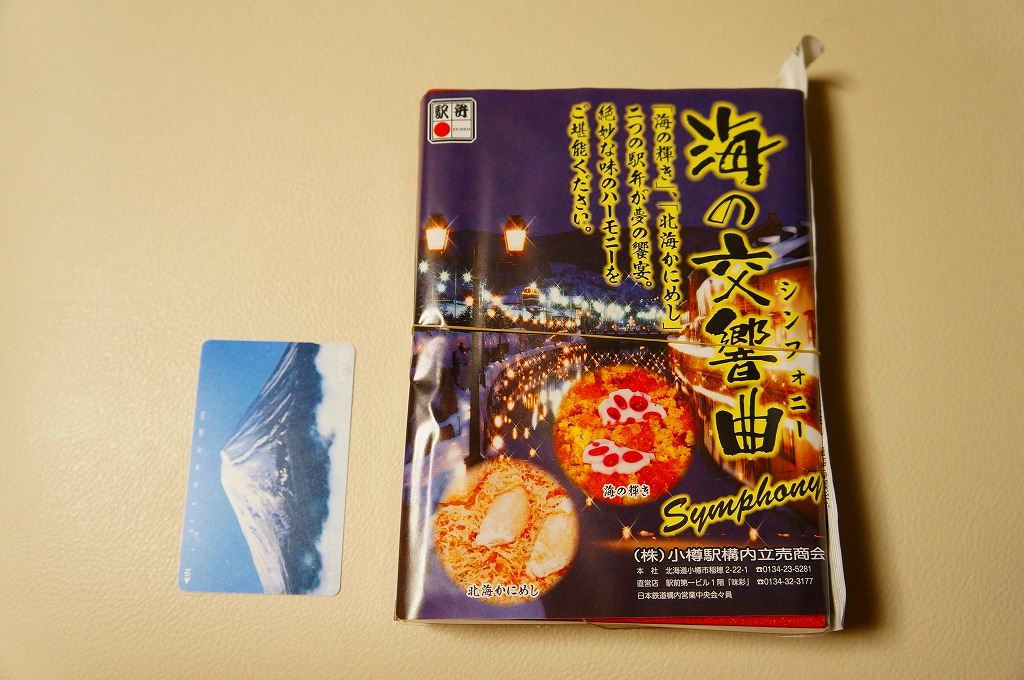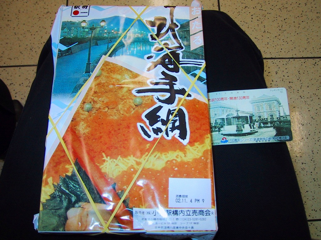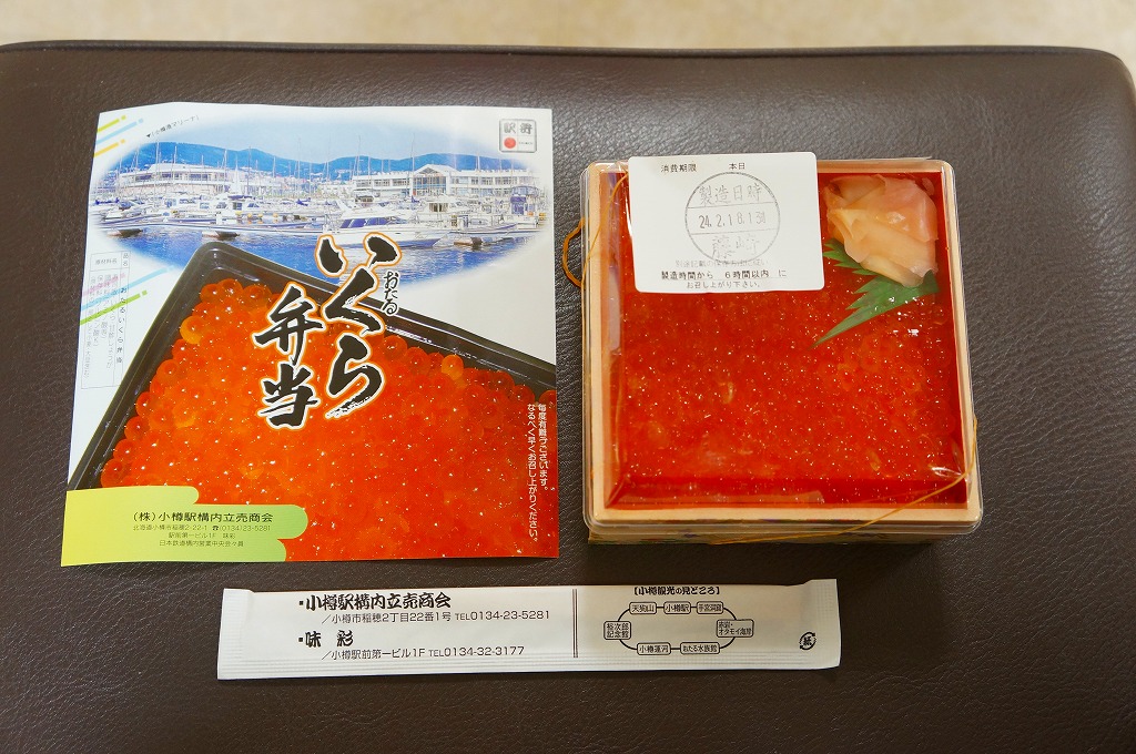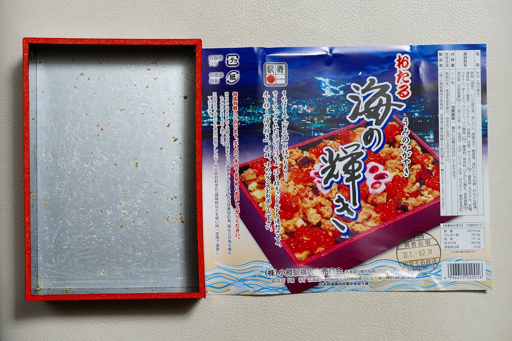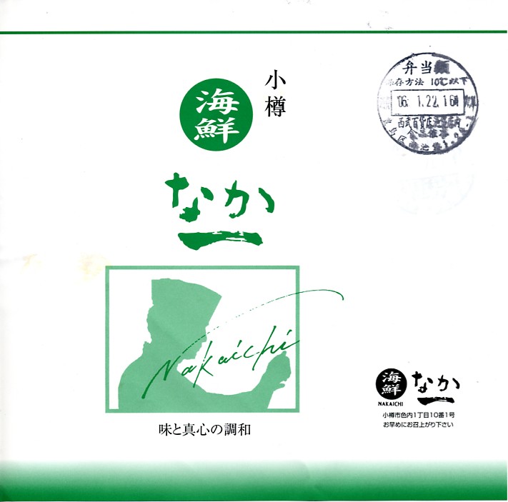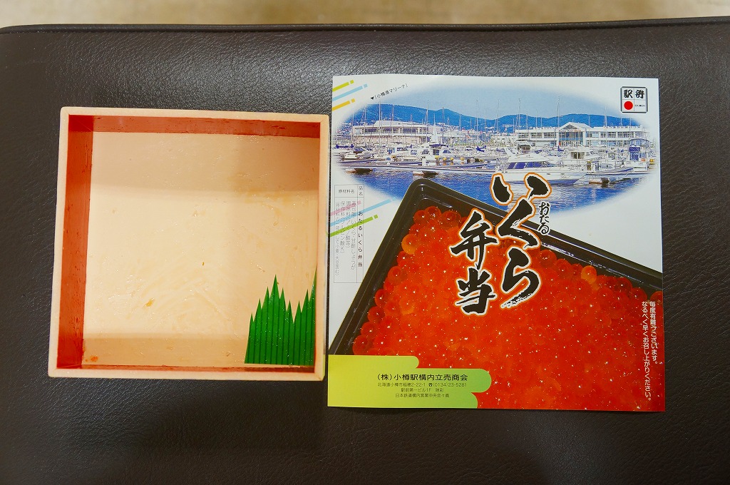 正方形の容器に、中身と小樽の町の写真を印刷した、容器をはみ出すくらい大きめの掛紙をかけて、割り箸とともに輪ゴムで留める。中身は掛紙と具の配置が異なるが素材は同じ、カズノコを和えたイカソーメンにイクラなどを御飯の上に載せたもの。なぜかこの駅弁にだけ、掛紙に駅弁マークが付いていない。