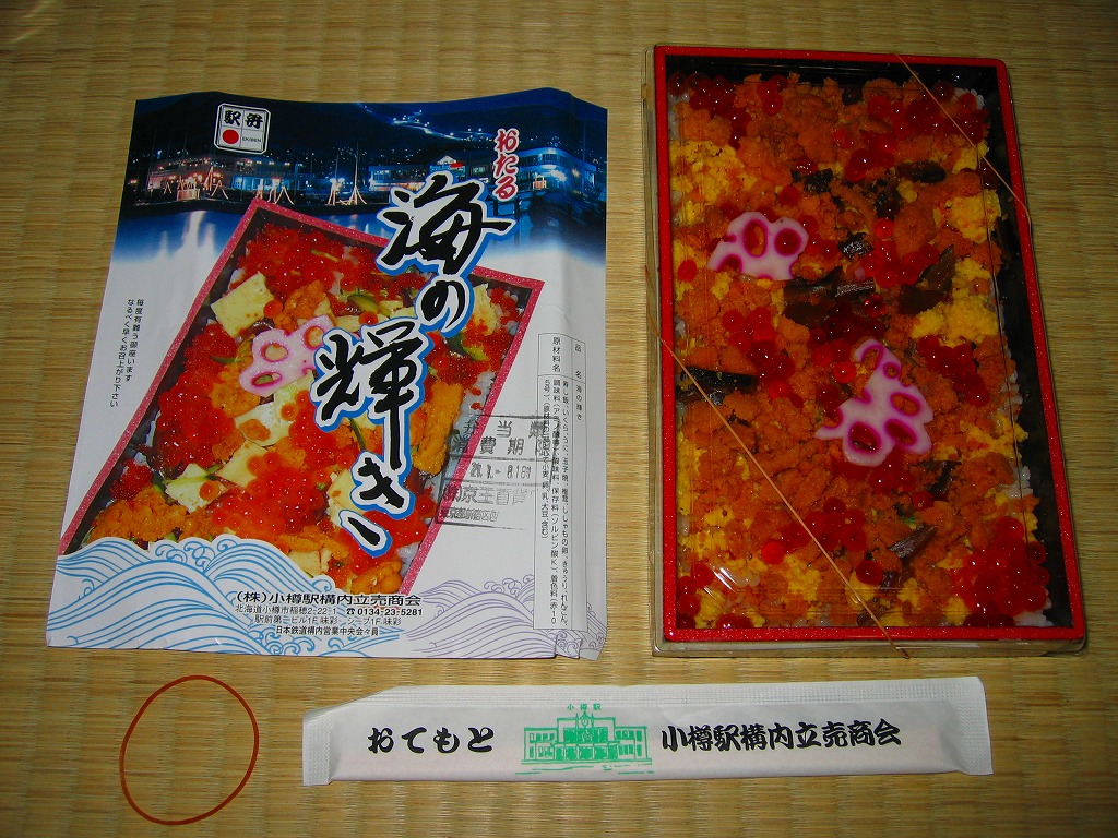 リクルートが北海道内で発行する月刊旅行情報誌「じゃらん北海道発」とのタイアップで、2003(平成15)年の9月から12月まで道内の8駅で各1種類が販売された「新・ローカル駅弁」の、小樽駅バージョン。その後も販売が続き、小樽駅を代表する駅弁となった。小樽駅の他の名物駅弁と同じ、柄物の底が浅い長方形の容器を使用、透明なふたをかけ、フルカラーの掛紙で覆う。中身は酢飯の上にウニやイクラや玉子焼やキュウリをちりばめて、蓮根でアクセントをつけるもの。その輝きは掛紙の見本写真よりも強く美しい。