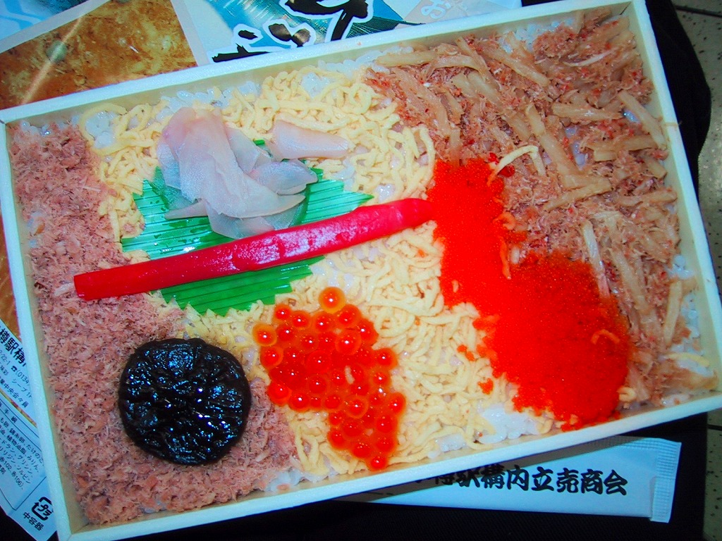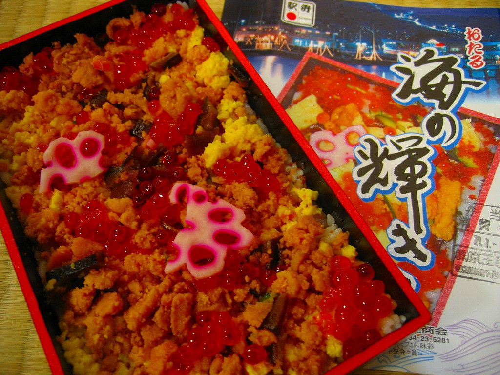 JR発足5周年に向けて、1991(平成3)年に発売。平たい長方形の折箱に酢飯を敷き、鮭フレーク、錦糸卵、ししゃも卵、カニほぐし身で覆い、イクラとシイタケとガリを添え、アスパラピクルス1本を置く。具の斜めのストライプで、漁船のロープをイメージしたという。デパートの駅弁大会での実演販売でも人気の商品。価格は2002年の購入時で1,050円、2014年4月の消費税率改定で1,080円、2017年時点で1,100円、2021年時点で1,150円、2023年時点で1,350円。