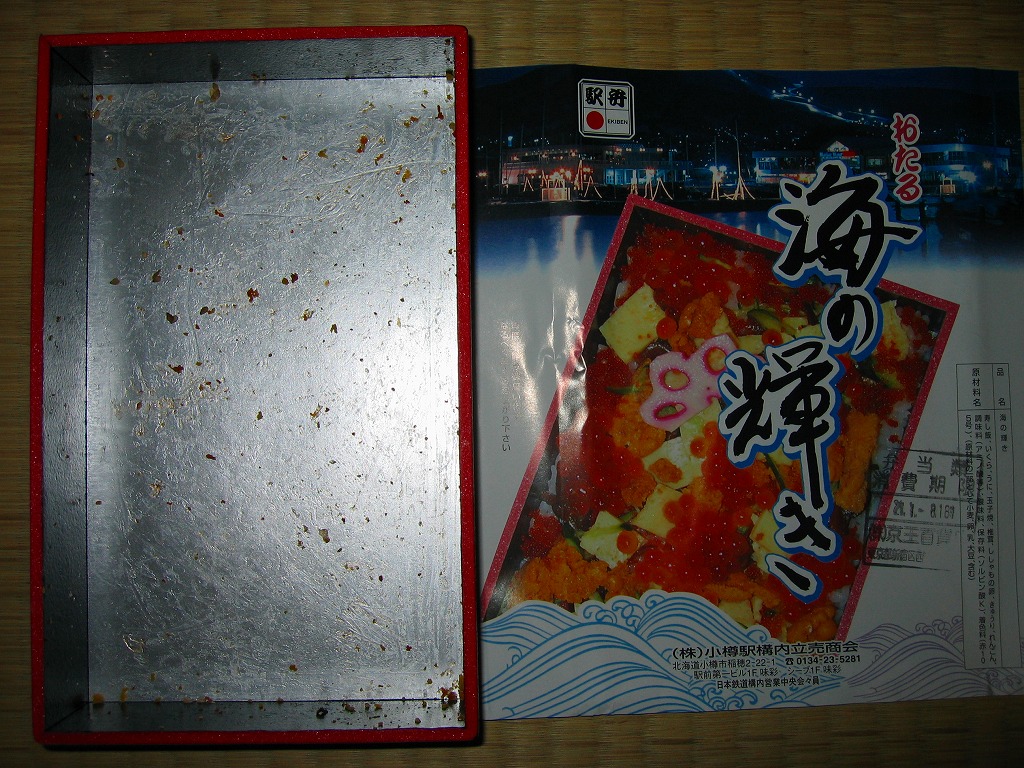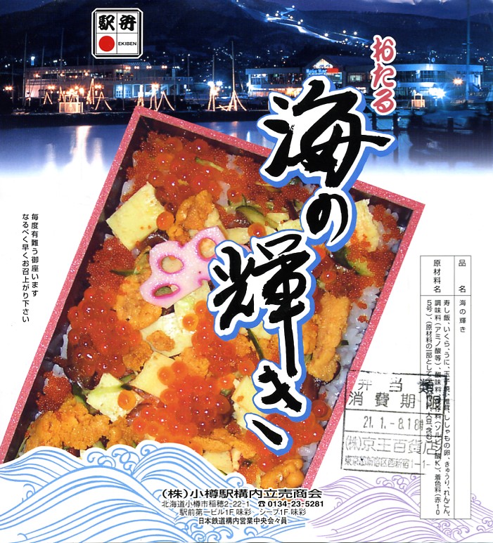 2006(平成18)年1月の京王百貨店の駅弁大会で、1,260円にて実演販売。上げ底上げ蓋で中身の見栄えが強調される催事海鮮弁当向けプラ容器を、その中身と小樽運河の夜景写真を載せた紙帯で巻いて、セロテープで留める。中身はウニの混ぜ御飯の上をカニほぐし身で覆い、カニ脚、イクラ、玉子焼などを載せるもの。価格は2014年4月の消費税率改定で1,290円。現存しない模様。