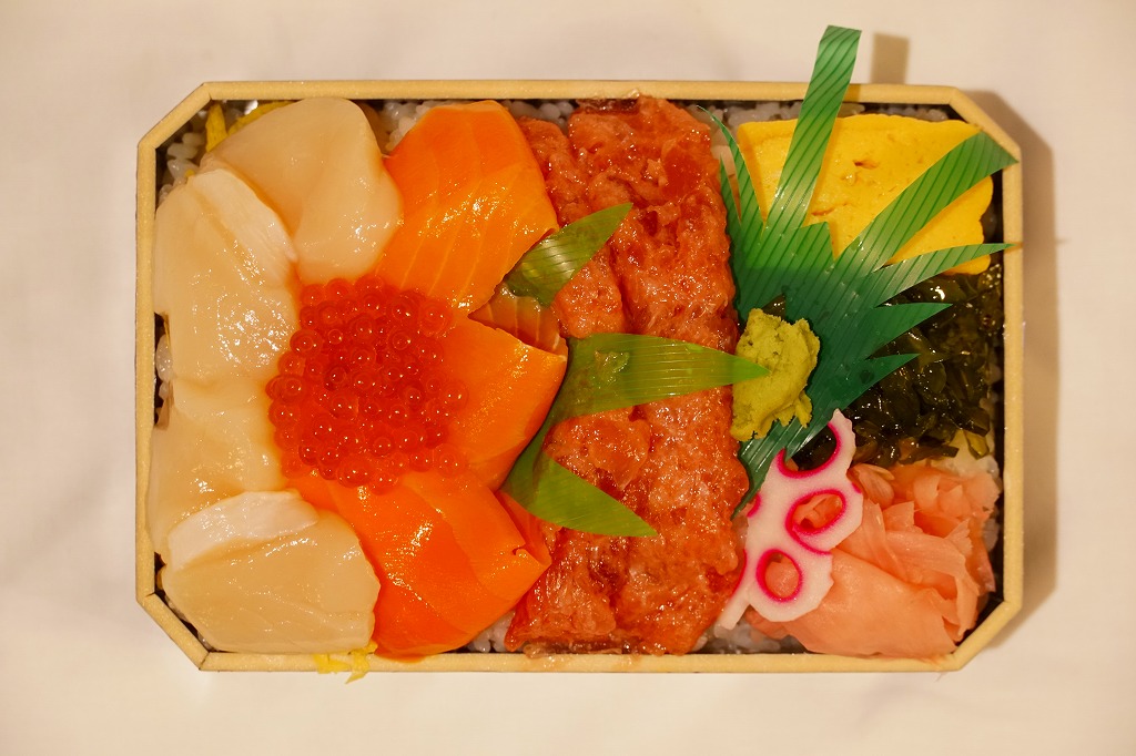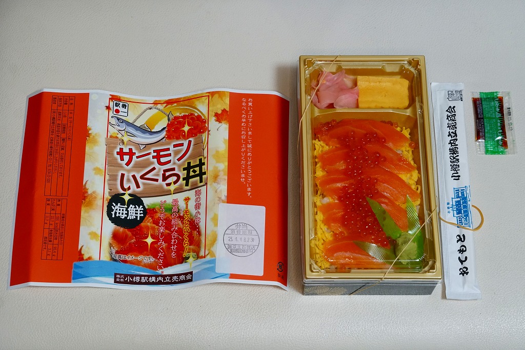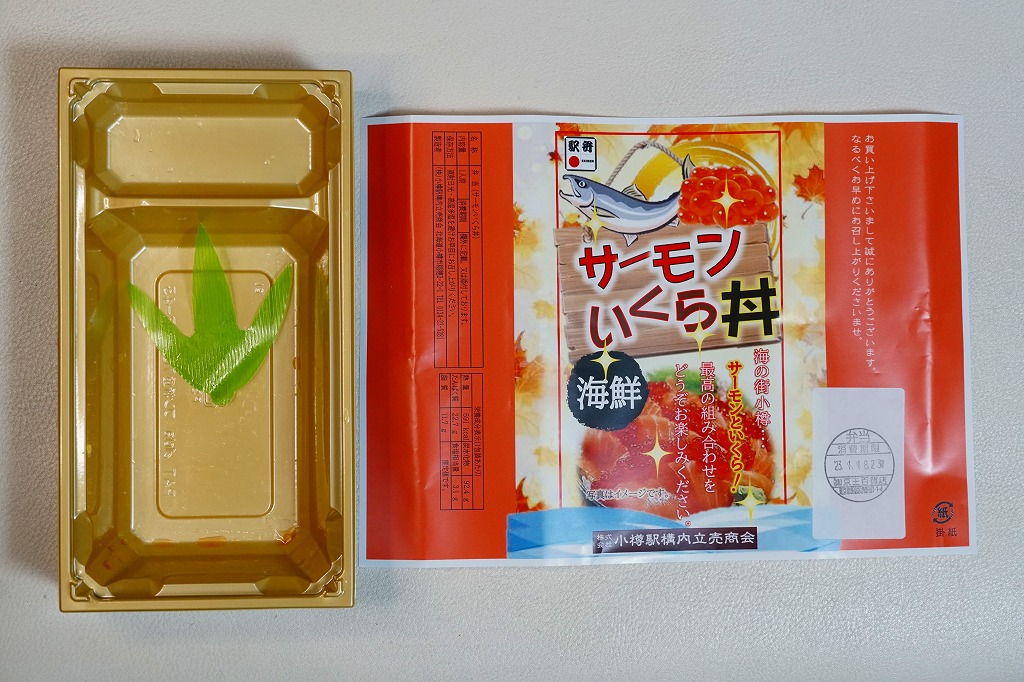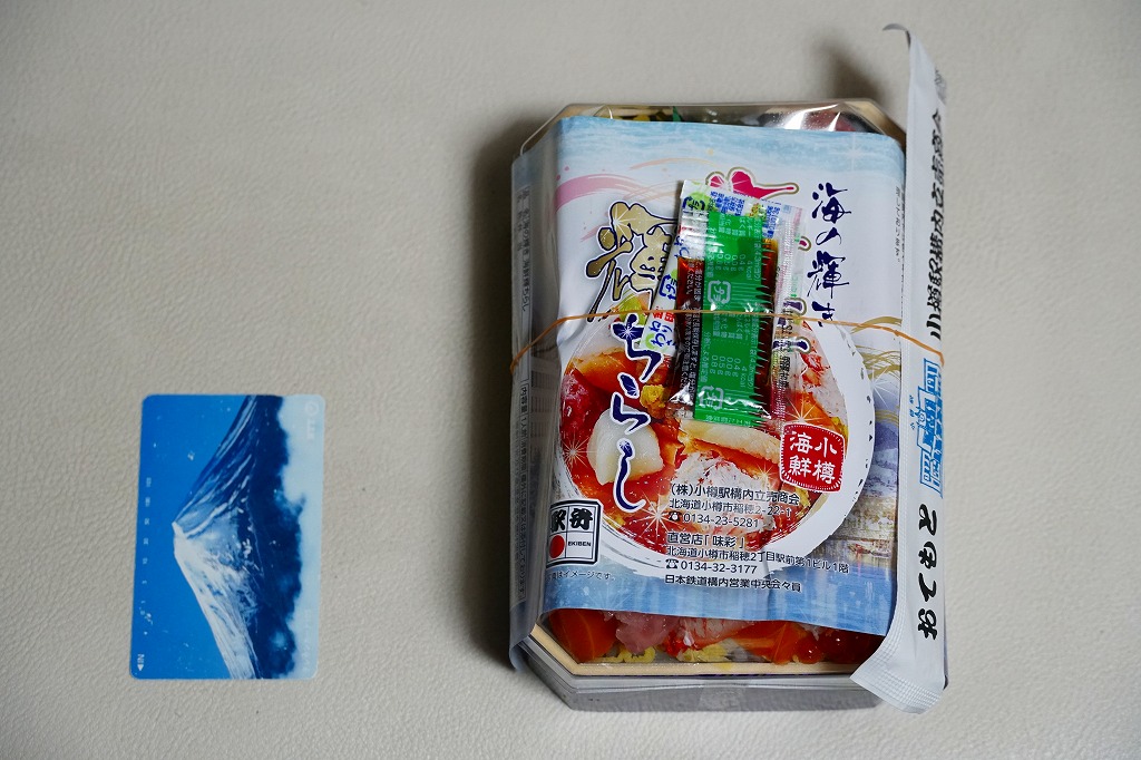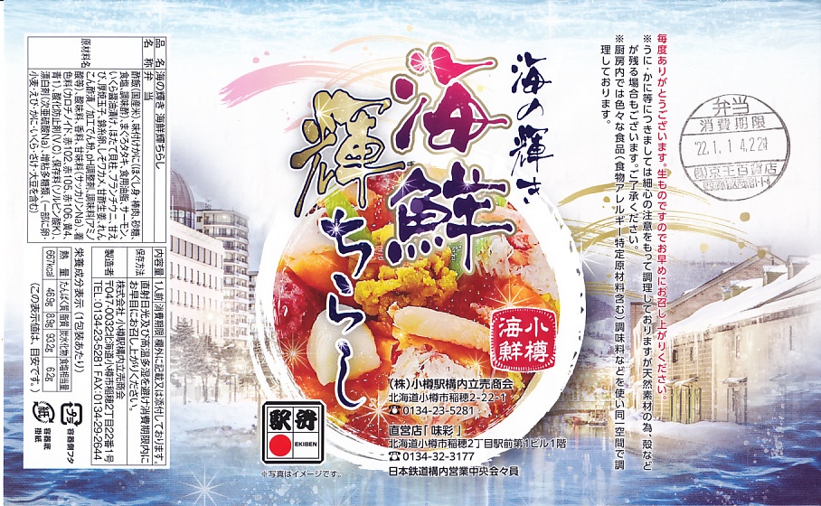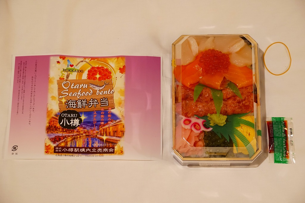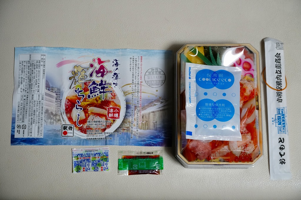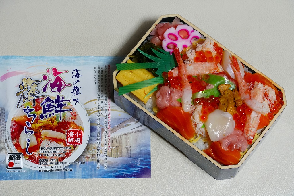 2023(令和5)年1月の阪神百貨店の駅弁大会で、小樽駅の駅弁として実演販売。上げ底と上げぶたが極端な、北海道物産展や駅弁大会などの催事向け容器に、酢飯を薄く敷き、ホタテ、サーモン、まぐろ、昆布、玉子焼、ガリを盛り付け、イクラとワサビと花れんこんとバランで彩る。見栄え重視の惣菜で、内容や風味はデパ地下の寿司や物産展の海鮮丼と同じようなもの。これが小樽駅で買えるとは思えないがどうか。百貨店の公式サイトの駅弁一覧にも掲載されなかった商品。