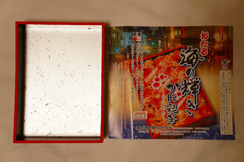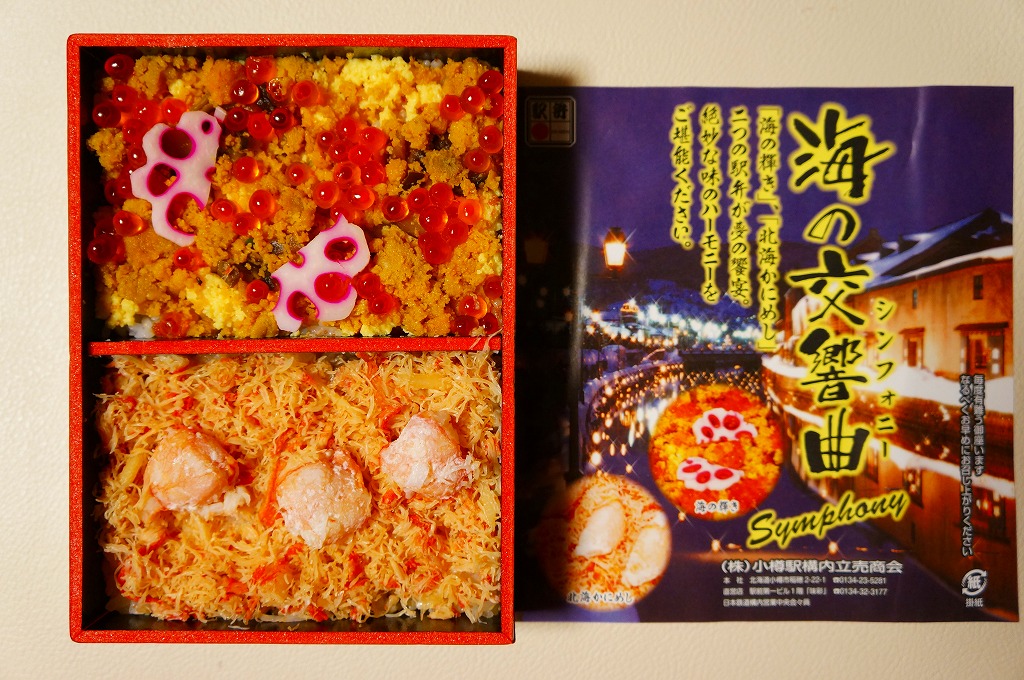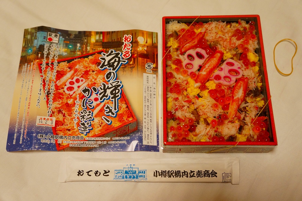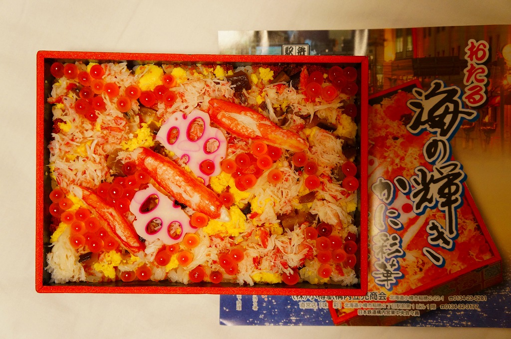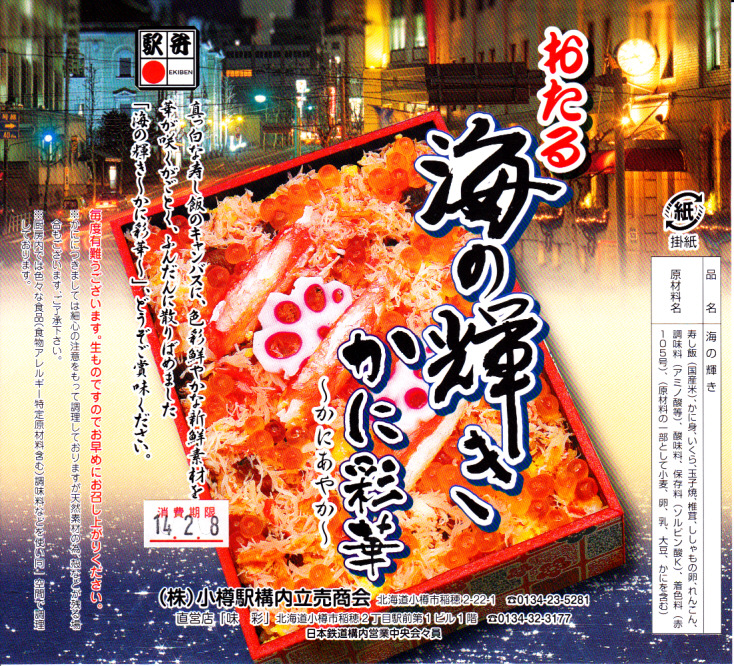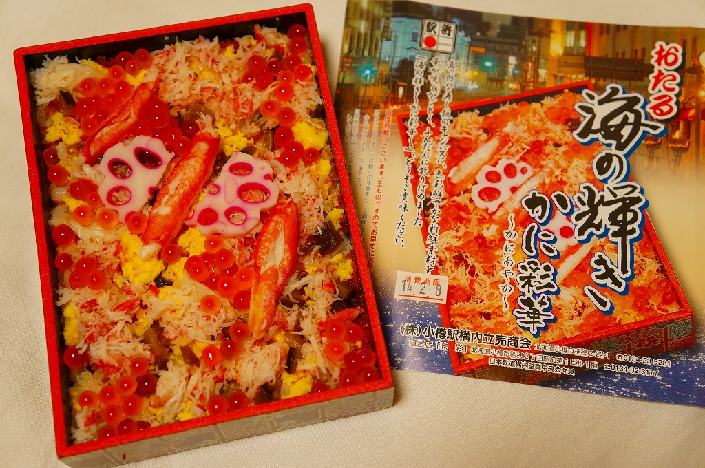 2015(平成27)年1月の京王百貨店の駅弁大会での実演販売でデビュー。同年4月の仙台駅でのNREの駅弁大会でおそらく輸送販売。これ以外で売られた買えたという話を見聞きしたことはないが、10月のJR北海道の車内誌には小樽駅弁として登場している。このページで紹介した過去の商品と同じく、酢飯の上にイクラ、カニ、玉子焼、シシャモ卵、シイタケ煮、青シソ漬などを散らす。あるいは「おたる海の輝き」のウニをカニに替えて新作にしたものか。その違いにより、風味も食感もより柔らかくなった印象。値段は2015年の購入時で1,380円、2020年時点で1,580円。2022年までの販売か。