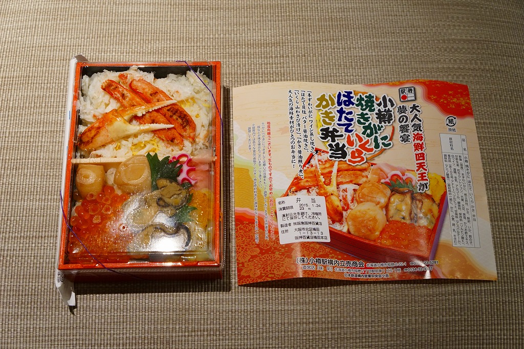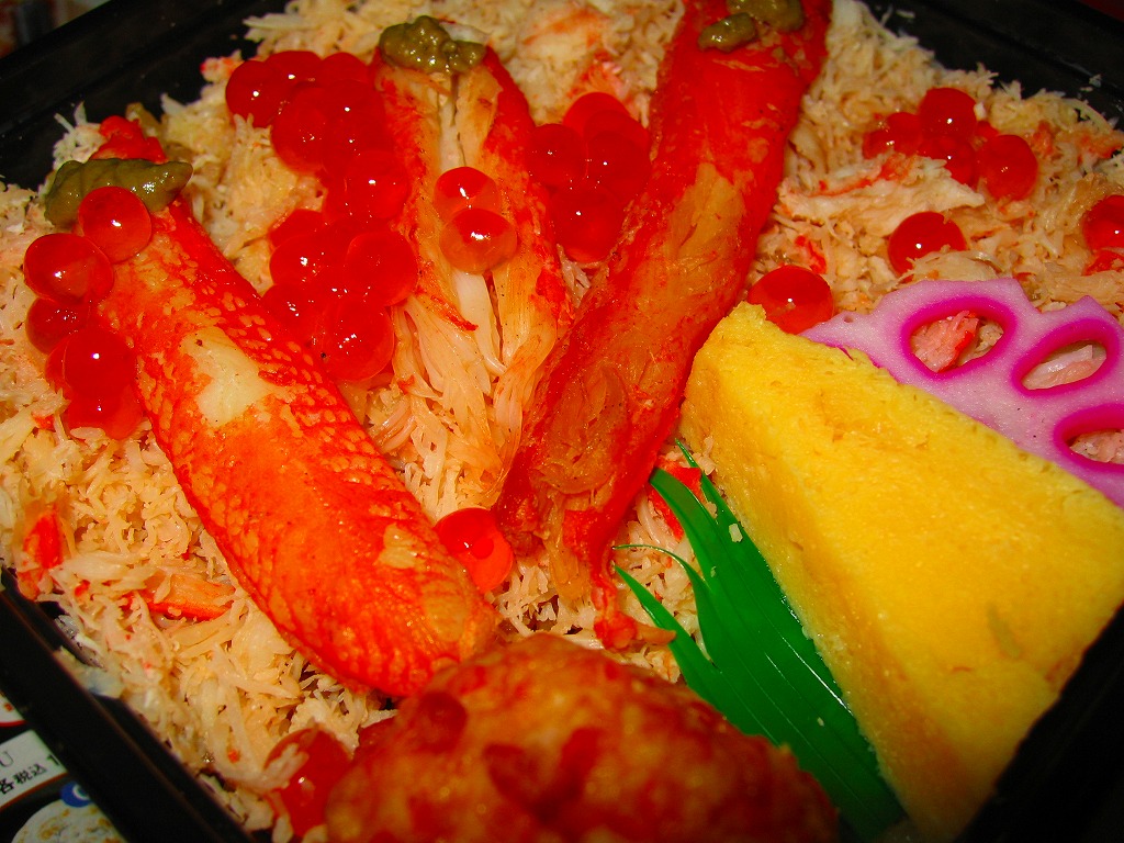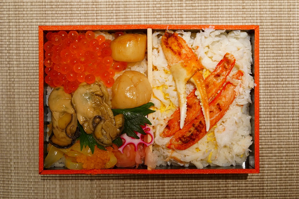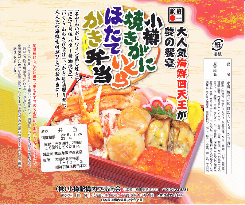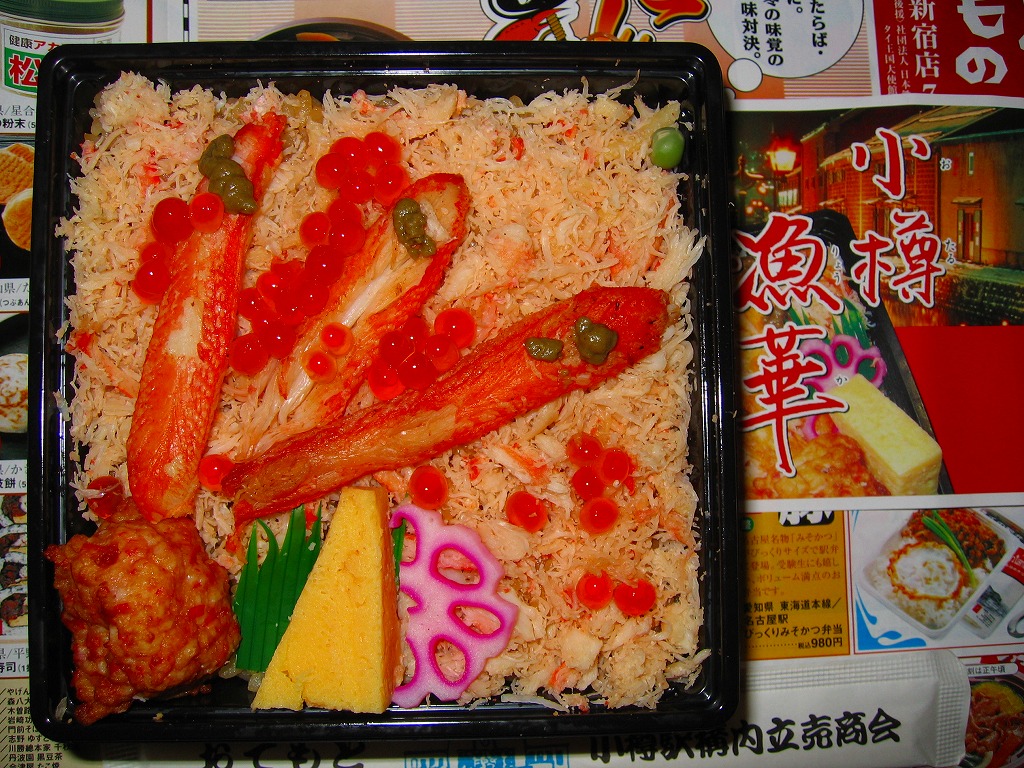 2015(平成27)年1月の阪神百貨店の駅弁大会で実演販売されたお弁当。商品名や掛紙の見本写真のとおり、2区画の酢飯の片側をカニほぐし身と焼きがにとカニ爪、片側をホタテ貝柱とイクラとカキ煮にイカやカズノコや甘酢生姜で覆った、豪華で賑やかなお弁当。北海道物産展の海鮮弁当の味を駅弁らしく平面に展開したものの、見るからに駅売りやキヨスク扱いに適さない具のセレクトに思えたし、実際にこの駅弁大会でしか売らない疑義駅弁であった模様。