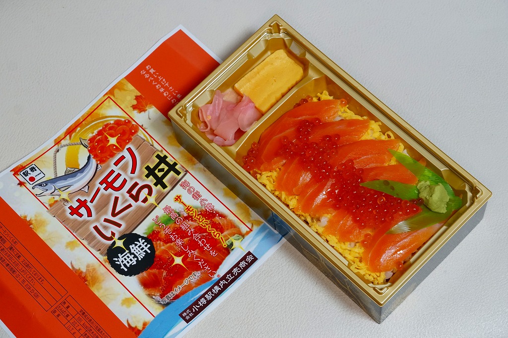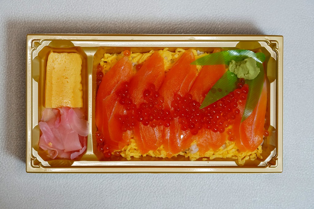 2023(令和5)年1月の京王百貨店の駅弁大会で実演販売。長方形のプラ容器に白飯を詰め、錦糸卵で覆い、サーモンの薄切りを並べ、イクラを載せて、わさびと玉子焼と甘酢生姜を添える。内容と掛紙の絵柄は華やかかもしれないが、具の薄さと量の少なさで、下記の本当に華やかな弁当と違い、こちらはそうでもなく、おとなしい。実演販売向けの兼用掛紙でなく、これ専用の掛紙が用意されたが、現地でも催事でも、この京王百貨店の駅弁大会以外で売られたという話を聞かない。
