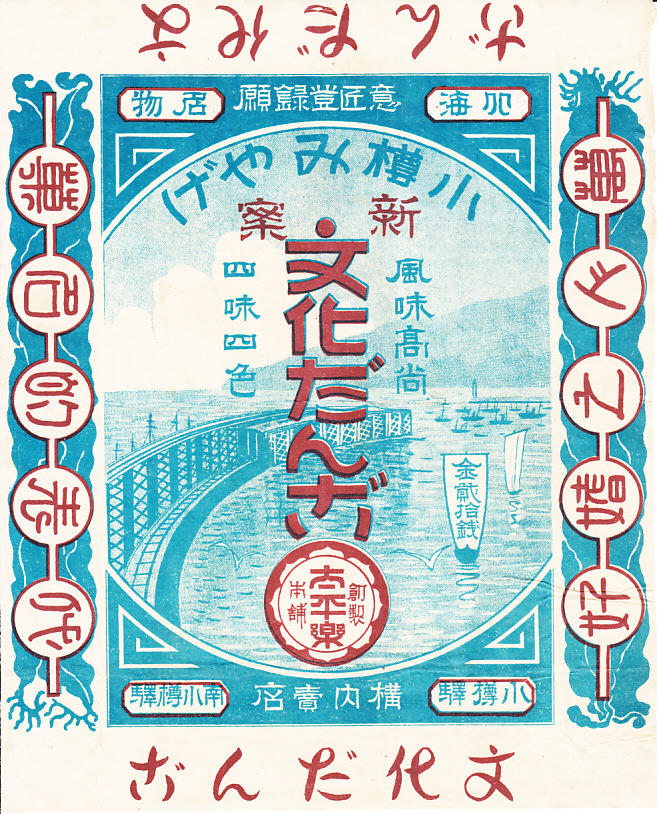 戦前のものと思われる、昔の小樽駅弁の掛紙。その名前から、弁当ではないと考えられる。1911(明治44)年から1944(昭和19)年まで小樽の名物であった、小樽港で石炭を積み出した手宮高架桟橋の絵柄を、「小樽駅 構内売店 南小樽駅」「小樽 意匠登録願 名物」「代表的名菓」「萬人之嗜好」「創製 太平楽 本舗」「小樽みやげ」「風味高尚」「四味四色」などの文字で囲む。