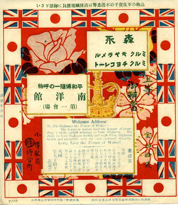 1922(大正11)年の調製と思われる、昔の小樽駅弁の掛紙。同年に上野公園で開催された平和記念東京博覧会で英国の皇太子殿下が来日されたことを記念して、全国各地の駅弁屋が同じデザインの記念掛紙を使用したもの。周囲に日本と英国の国旗を配し、右に駅弁の名前、左下に調製元、下部に日英の歓迎文、上部の2枠は広告枠。