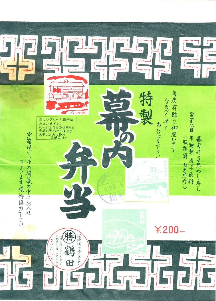 昭和40年代頃の、8月2日14時の調製と思われる、昔の小樽駅弁の掛紙。小樽市の市内局番が2桁になった1972年頃より前のものか。鰊御殿、日和山燈台、水族館が簡単なスタンプのようなイラストで描かれる。小樽が観光地として認識されるのは1990年代に入ってからだと思うし、その目玉である運河はここに登場しない。