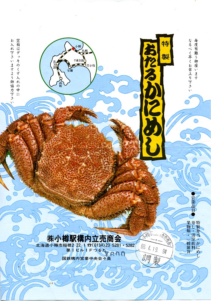 1985(昭和60)年4月19日9時の調製と思われる、昔の小樽駅弁の掛紙。現在の同じ名前の駅弁は中身と駅舎の写真を掲載するが、当時のものは毛ガニの写真と道南の地図を描き、こちらのほうがスケール感がある。