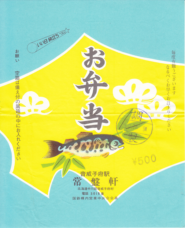 1981(昭和56)年12月28日9時の調製と思われる、昔の音威子府駅弁の掛紙。中身はおそらく幕の内だろう。絵柄は北海道とササとマツ?と、魚はサケかニジマスか。昭和時代の音威子府駅は、宗谷本線が天北線を分ける駅で、有名な駅そばに加えて幕の内や寿司の駅弁が、駅のホーム上で売られた。
