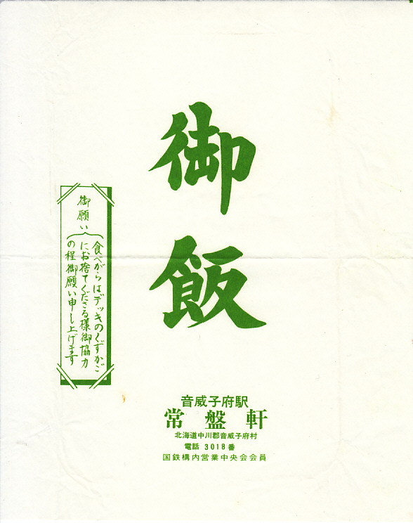 入手状況から1980年代頃のものと思われる、昔の音威子府駅弁の掛紙。御飯とおかずで折箱を分けるような上等幕の内や、このような駅弁が、音威子府駅にあったのかどうかは分からない。仕出し弁当向けの掛紙にしては、鉄道に関する表記が強すぎる。