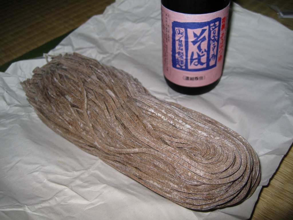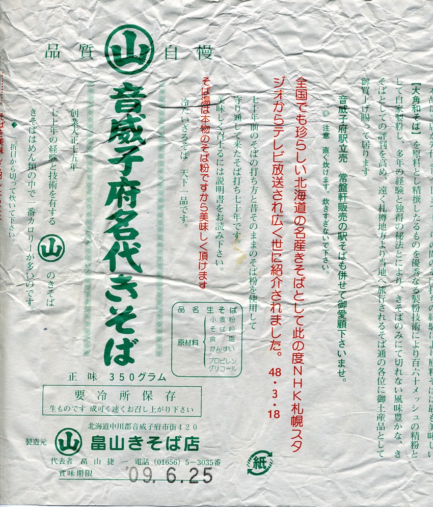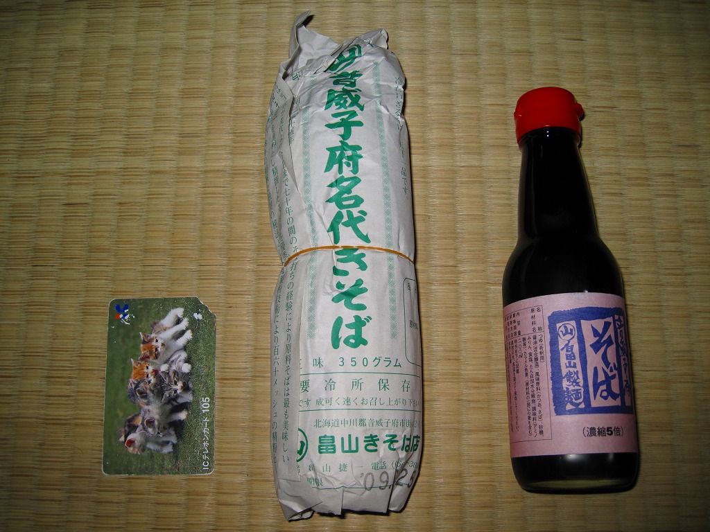 音威子府駅舎内の立ち食いそば店で売られていた生麺。包装紙で麺を直接包んで、輪ゴムで留めるだけ。駅で実際に使われている畠山製麺のそばなので、瓶入りの温そば用濃縮つゆ(300円)も買い、自宅で調理してみると、現地で食べたものと同じ味を再現できた。2021年2月に駅そば屋は閉店してしまったが、これは村内のどこかで買える気がしている。