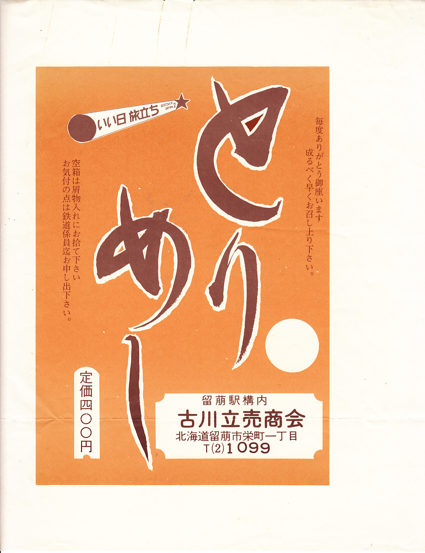 1980年頃のものと思われる、昔の留萠駅弁の掛紙。炭鉱はなくとも海産で賑わい、留萠本線が羽幌線を分けていた頃の留萠駅弁といえば、この「とりめし」であった。
