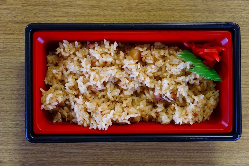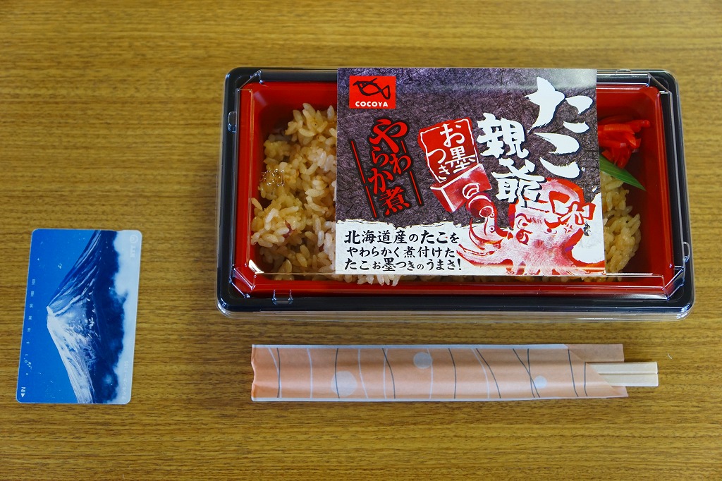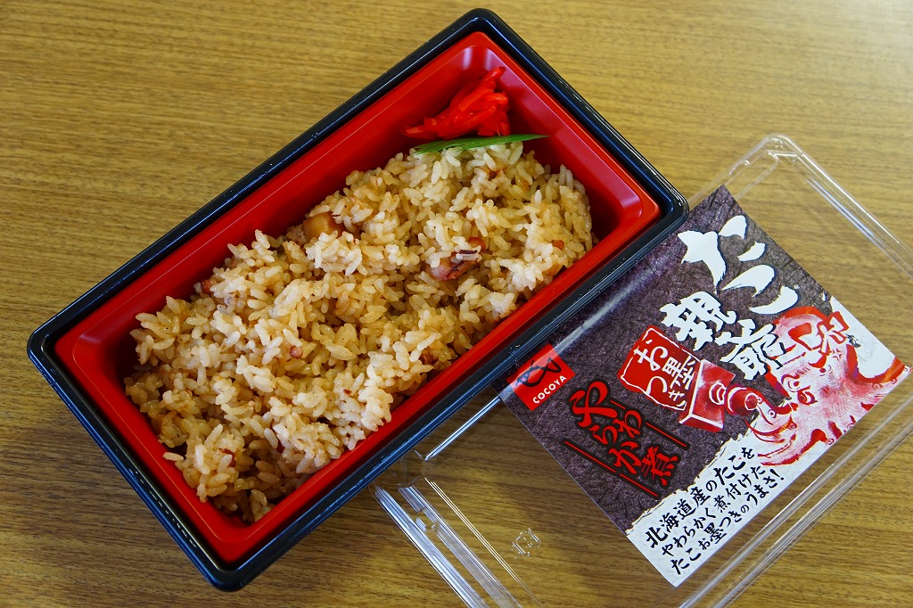 増毛駅で買えたお弁当。地元の水産加工販売業者の直売店が、2012(平成24)年4月から増毛駅舎に入居しており、この会社が売るタコ飯ないしタコ加工食品である模様。プラ製の容器に、タコ飯と紅生姜を詰めたお惣菜。小さく刻んだ柔らかいタコと、醤油飯の味を楽しめた。増毛駅は2016年12月4日限りでなくなるが、増毛駅の駅舎と敷地は増毛町へ無償で譲渡されるそうで、この商品も継続して売られる可能性があると思う。