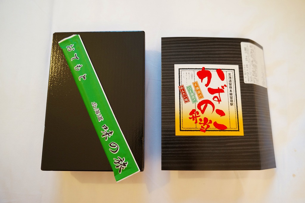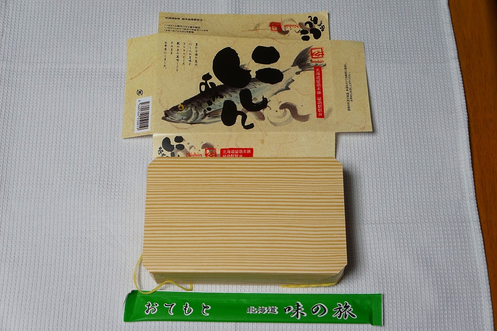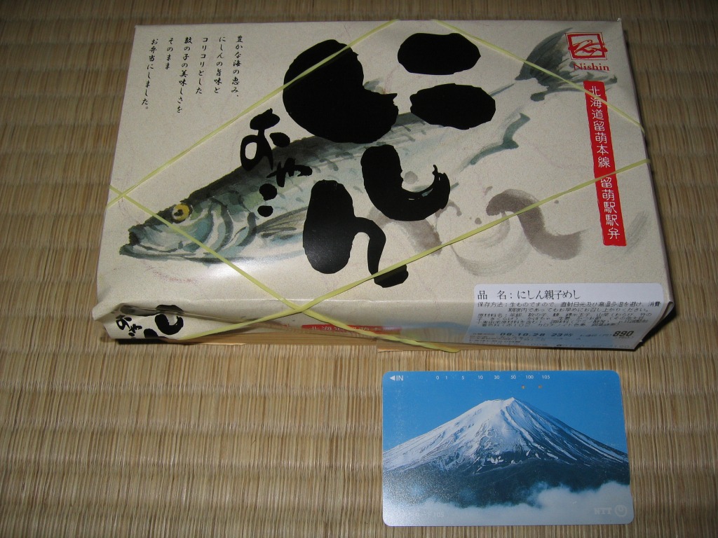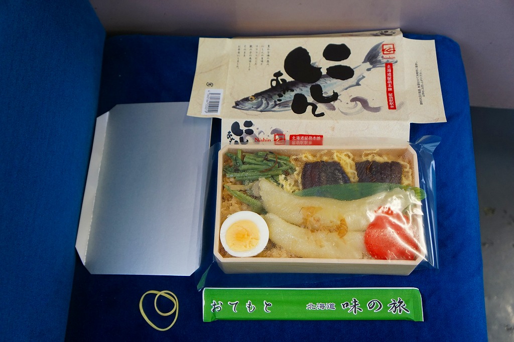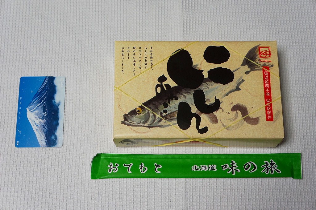 上記の駅弁「にしんおやこ」を、現地で買ったもの。これを売る留萌駅の立ち食いそば店に、駅弁の存在を示す掲示も案内も実物もないが、店員に「明日の何時に弁当を何個」と注文すると、これが買えた。前日までの予約が必要。駅や観光案内所やネット上で配布する留萌のイラストマップで、駅弁の存在を知ることができた。