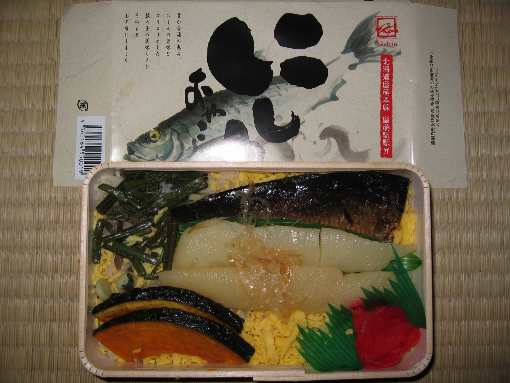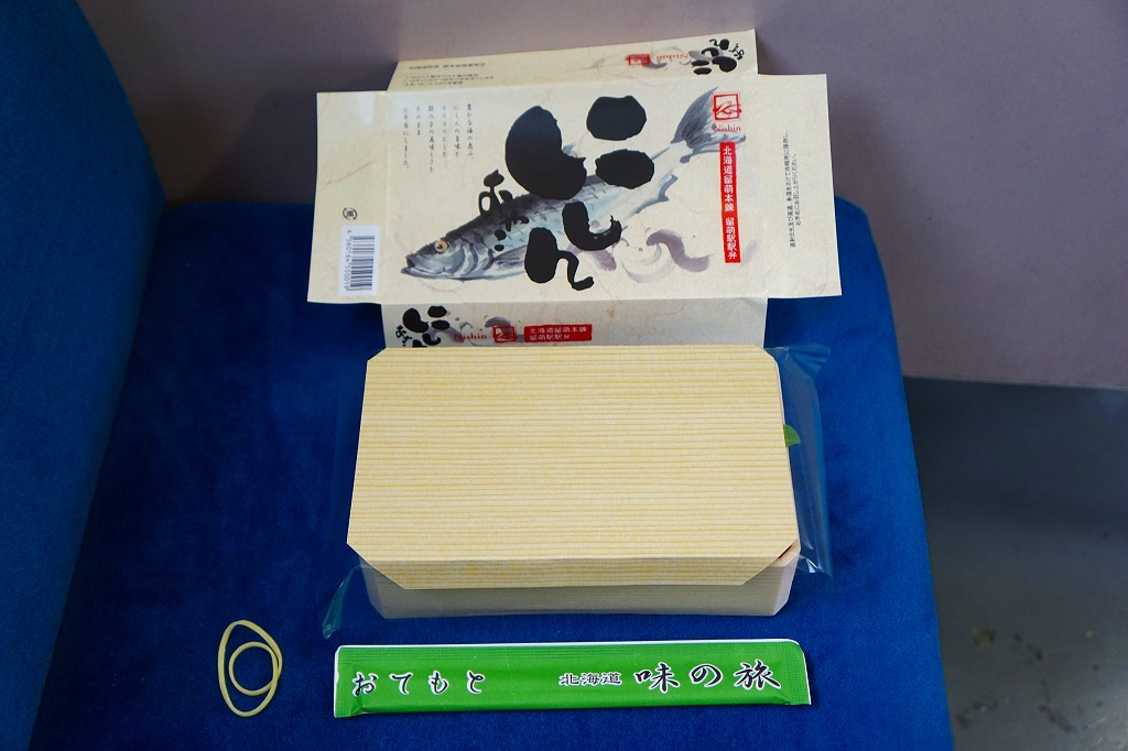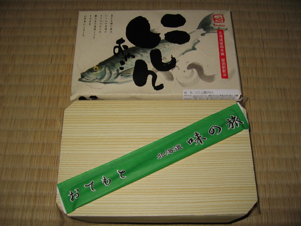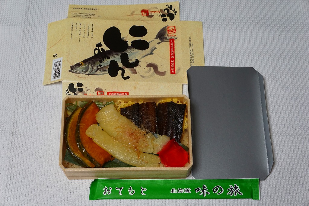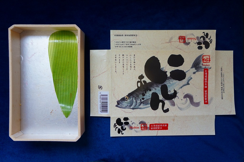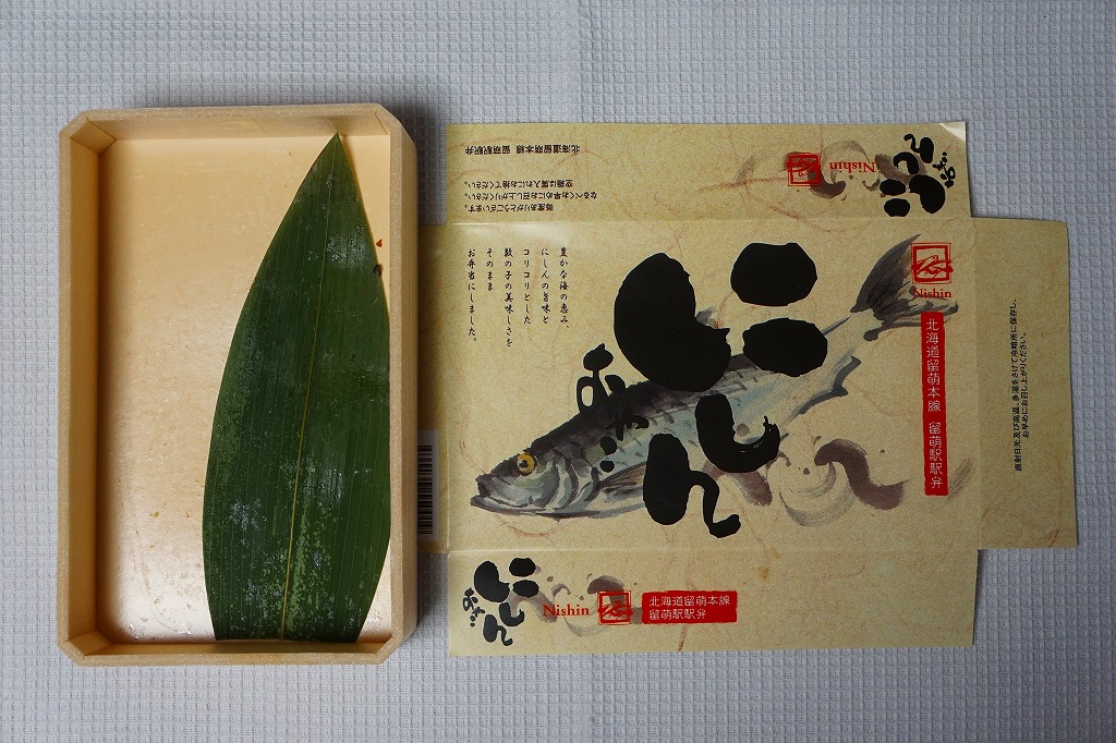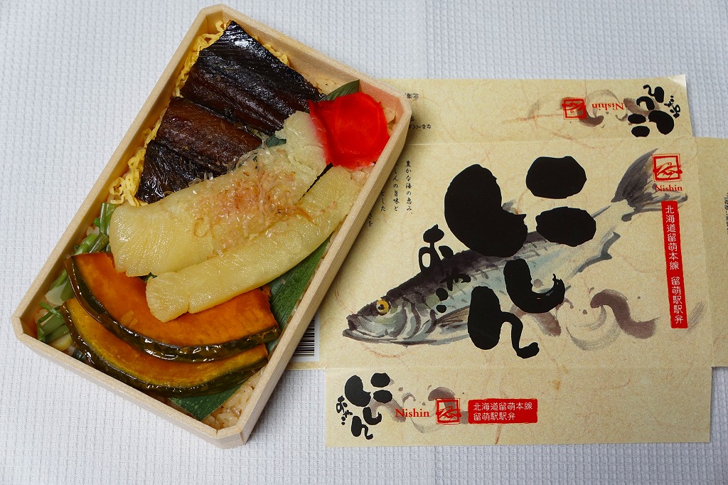 2003(平成15)年8月30日に発売された、留萌駅で約15年ぶりの駅弁。木枠の長方形の容器に木目柄の紙ふたをかけ、さらにニシンと商品名を描く紙ふたを置いて、輪ゴムでしばる。中身は茶飯の上にニシン、カズノコ、かぼちゃ、山菜などを置くもの。2本のカズノコは太く、ニシンも分量十分。個人的に高価で正月に一度だけ少量が食べられるカズノコと、高級魚化した後のニシンしか知らないので、価格に割安感を覚える。風味も柔らかくしっかり。価格は2003年の発売時や2018年の購入時で890円、2020年7月に道の駅るもいで売り始めた時点で900円、2023年時点で1,000円。