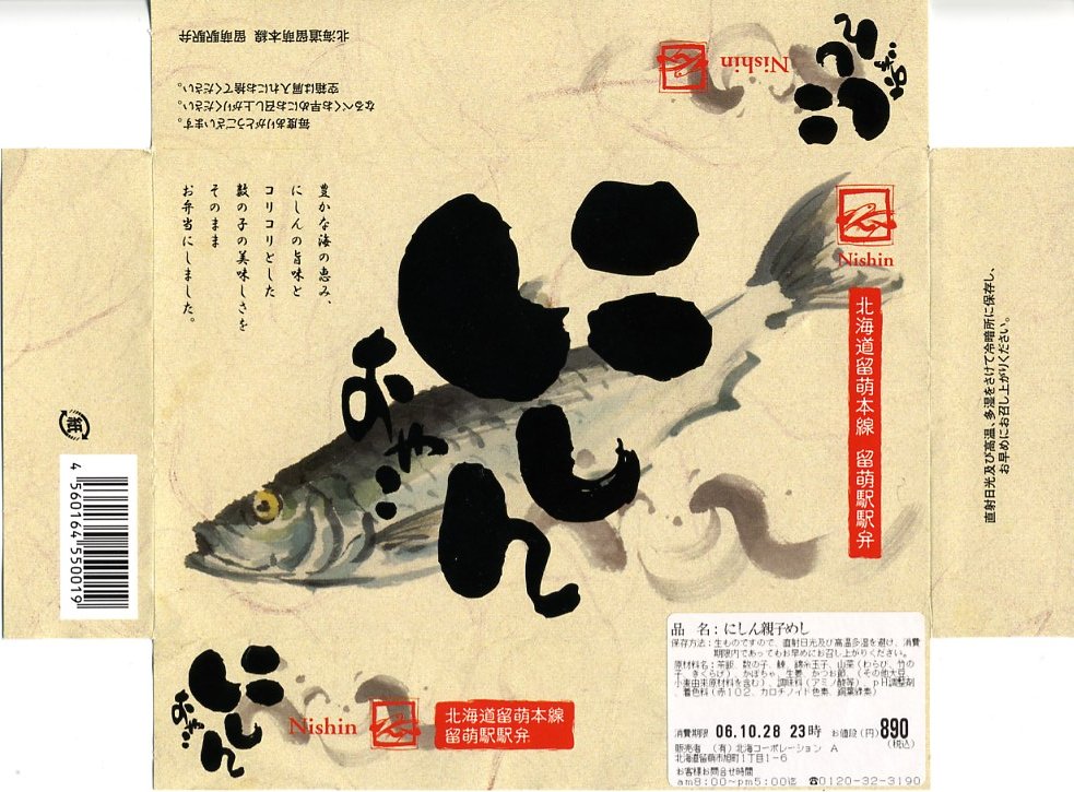 2006(平成18)年10月28日に購入した、留萌駅弁の掛紙。後の物と同じ。容器や中身も同じ。当時は掛紙に食品表示ラベルを貼り、そこに販売者の名称と所在地と連絡先を記していた。
