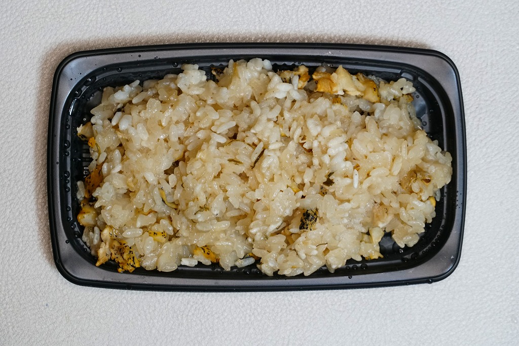 掛紙は現役当時のものをカラーコピー。容器は現地の掲示や通販サイトの掲載では黒塗りの重箱であるが、ここでは冷凍食品の通信販売で黒いプラ製トレー。その中につぶ貝の混ぜ御飯だけを詰める。貝の飯なのに臭みも固さもない、滋味あふれる感じ。イベントの終了後も、かつての駅舎に入居した観光案内所で、冷凍食品として予約販売される。カラーコピー掛紙だけの販売もある。
