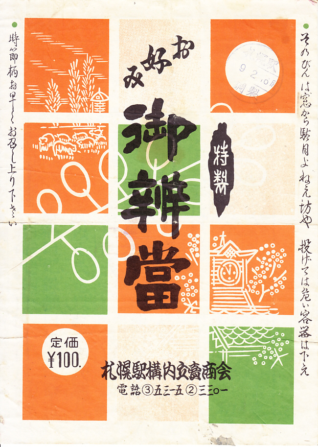 1950年代のものと思われる、昔の札幌駅弁の掛紙。普通弁当の価格が100円以内となった1954(昭和29)年以降、札幌市の市外局番が2桁になった1963(昭和38)年頃以前のものか。時計台と牧場が描かれる、おそらく上等幕の内弁当。