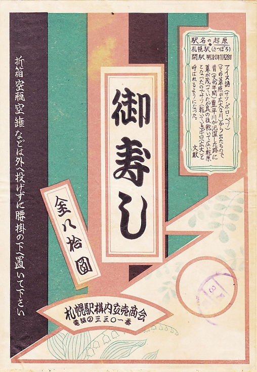 1953(昭和28)年3月不明日の調製と思われる、昔の札幌駅弁の掛紙。歌舞伎など芝居小屋の引幕である定式幕(じょうしきまく)の色遣いを持つストライプ。札幌駅の駅名の起源が記される。サッポロの地名の由来を、アイヌ語のサツ・ポロ・ベツ、乾いた大きな川だとするのは、定説でなく通説とされる。