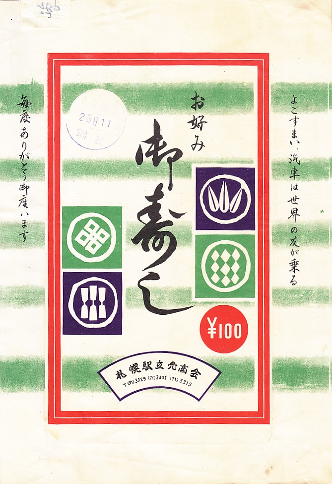 1963(昭和38)年11月23日11時の調製と思われる、昔の札幌駅弁の掛紙。寿司にちなむアイコンを並べたように見える。「よごすまい、汽車は世界の友が乗る」は、この頃の国鉄で使われたマナー標語のようだ。