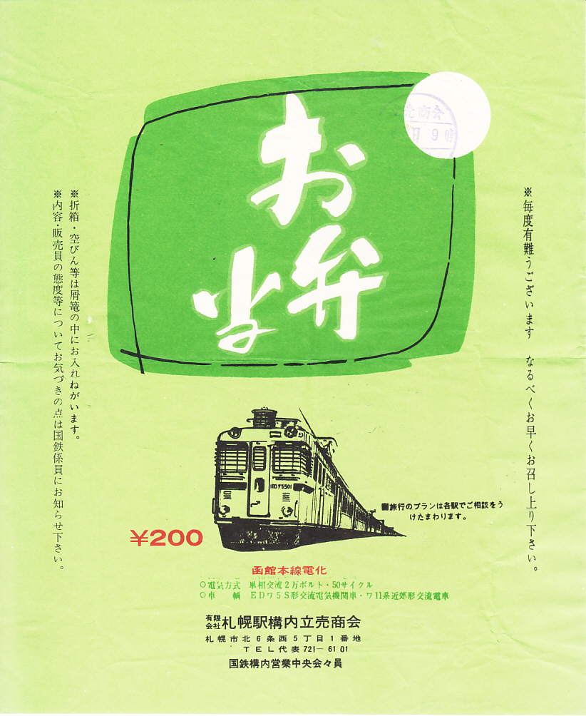 1970(昭和45)年8月23日9時の調製と思われる、昔の札幌駅弁の掛紙。1968(昭和43)年8月の函館本線電化を小さく記念するが、車両形式のED75S形を「EDワ5S形」と、711系を「ワ11系」と誤植した。電気機関車ED75501のイラストも実物に似付かぬ姿で、どうしてこうなったのか。今も池田駅で使われる絵柄と同じに見える。