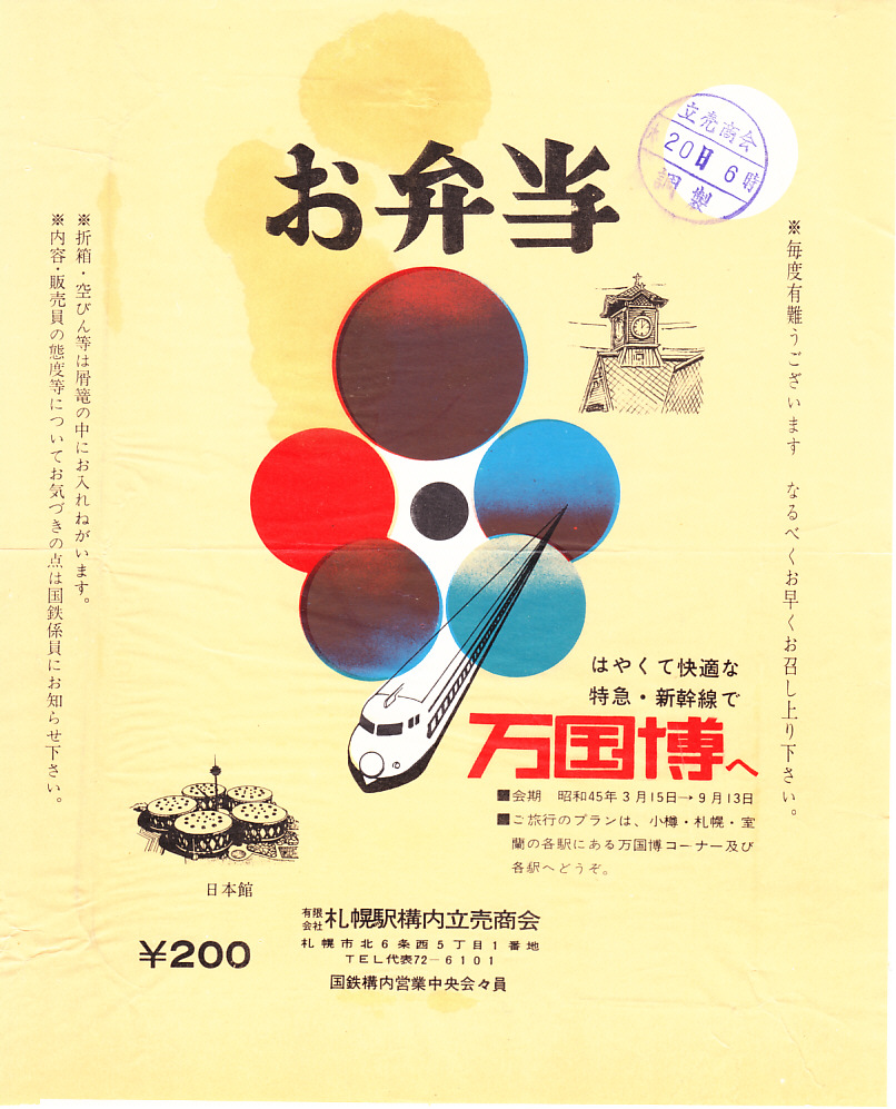 1970(昭和45)年の調製と思われる、昔の札幌駅弁の掛紙。札幌の時計台と大阪万博の日本館が新幹線で結ばれている。札幌駅と新大阪駅や大阪駅を鉄道で移動する場合、新幹線経由で21時間以上、当時一般的な日本海縦貫線経由で24時間以上を要した時代である。