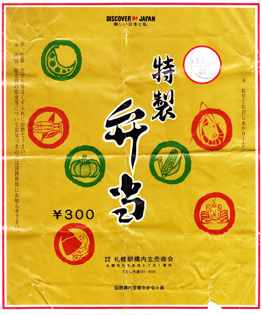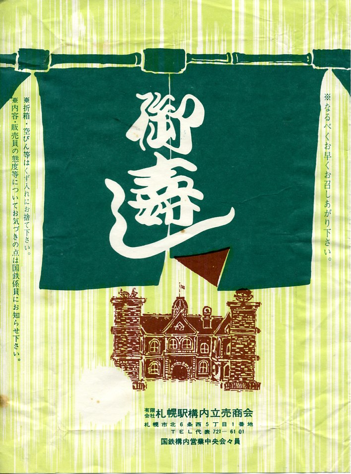 1970(昭和45)年頃のものと思われる、昔の札幌駅弁の掛紙。1970(昭和45)年8月の札幌市の市内局番の変更が反映され、同年10月からの国鉄の旅行キャンペーン「ディスカバー・ジャパン」のロゴがない。中身はおそらく助六寿司だろう。どこの物か分からないのれんの向こうには、今でも札幌市街で大きな敷地と存在感を持つ北海道庁旧本庁舎が、門の外から描かれる。
