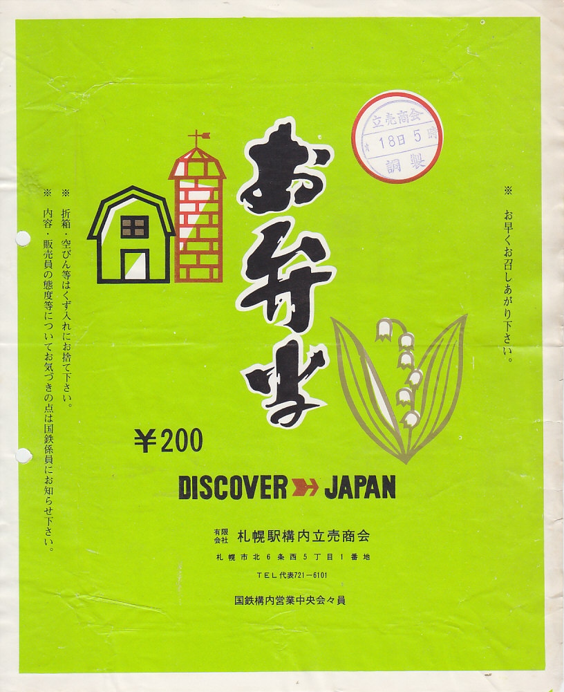 入手状況から1971(昭和46)年8月の、18日5時の調製と思われる、昔の札幌駅弁の掛紙。牧舎とサイロとスズランで、北海道らしい雰囲気の絵柄とした感じの、緑色の掛紙。