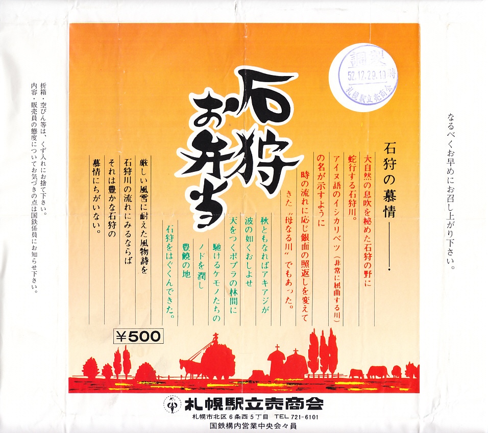 1977(昭和52)年12月29日19時の調製と思われる、昔の札幌駅弁の掛紙。後の「幕の内いしかり」に相当する幕の内弁当ではないかと思う。石狩の慕情として、石狩川を詠む文章を掲載する。