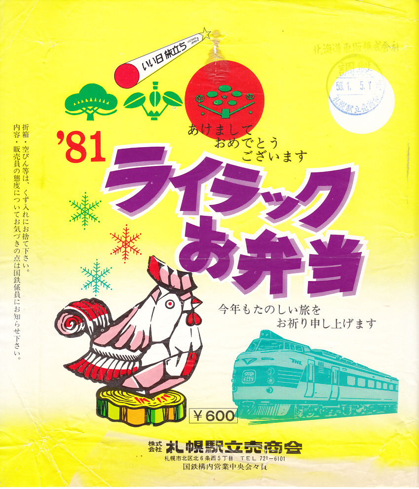 1981(昭和56)年1月5日7時の調製と思われる、昔の札幌駅弁の掛紙。下記の「石狩お弁当」と同じく、正月限定の駅弁掛紙の1981年版。前年の10月に室蘭駅〜札幌駅〜旭川駅のエル特急「ライラック」が登場したことで、駅弁の名前を変えたのだろうか。特急電車の絵柄も、掛紙に記される。