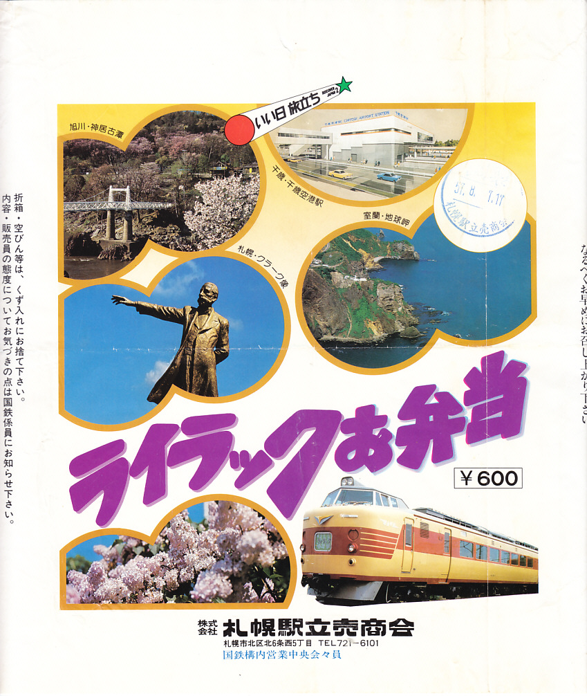 1982(昭和57)年8月7日17時の調製と思われる、昔の札幌駅弁の掛紙。旭川の神居古潭、千歳の千歳空港駅、札幌のクラーク像、室蘭の地球岬、ライラックの花、国鉄特急ライラック号の写真を使う、分かりやすい絵柄。