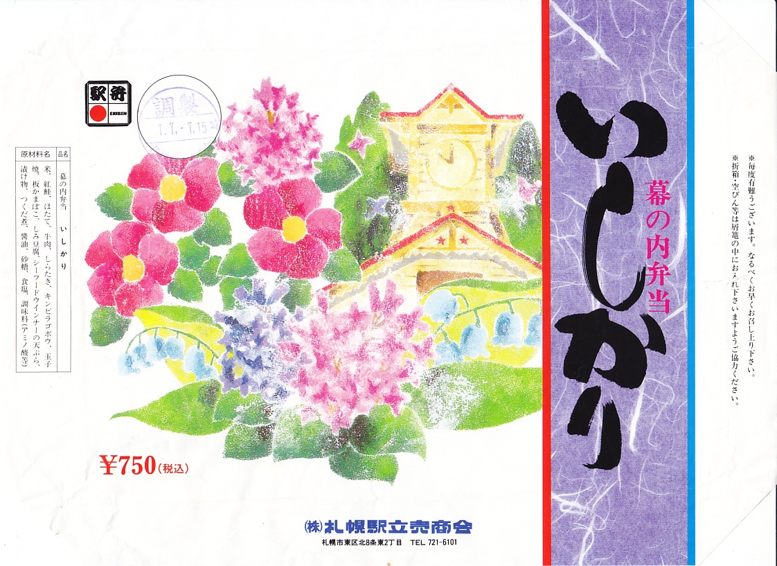 1995(平成7)年7月7日15時の調製と思われる、昔の札幌駅弁の掛紙。その絵柄は、上記の2004年9月のものと同じ。ライラックやスズランなどの花に囲まれた札幌時計台を描く。札幌時計台は、大都会のビル街に埋もれたガッカリ名所と言われるが、このような構図で写真に収めることはできるらしい。