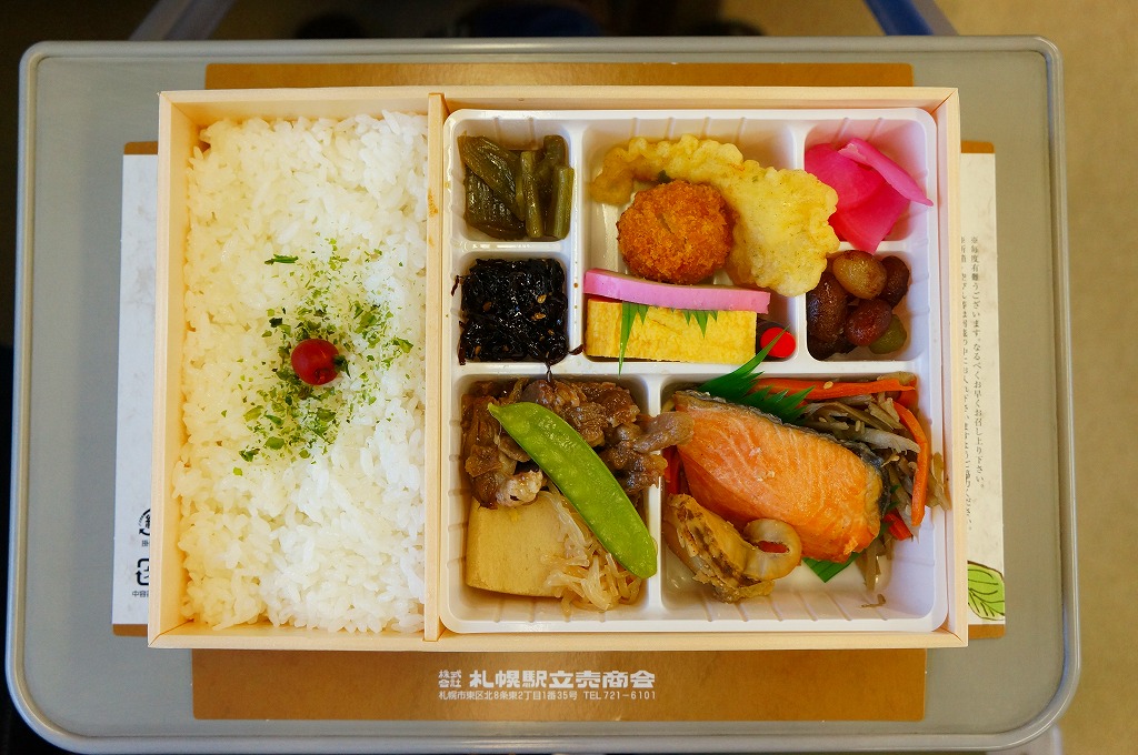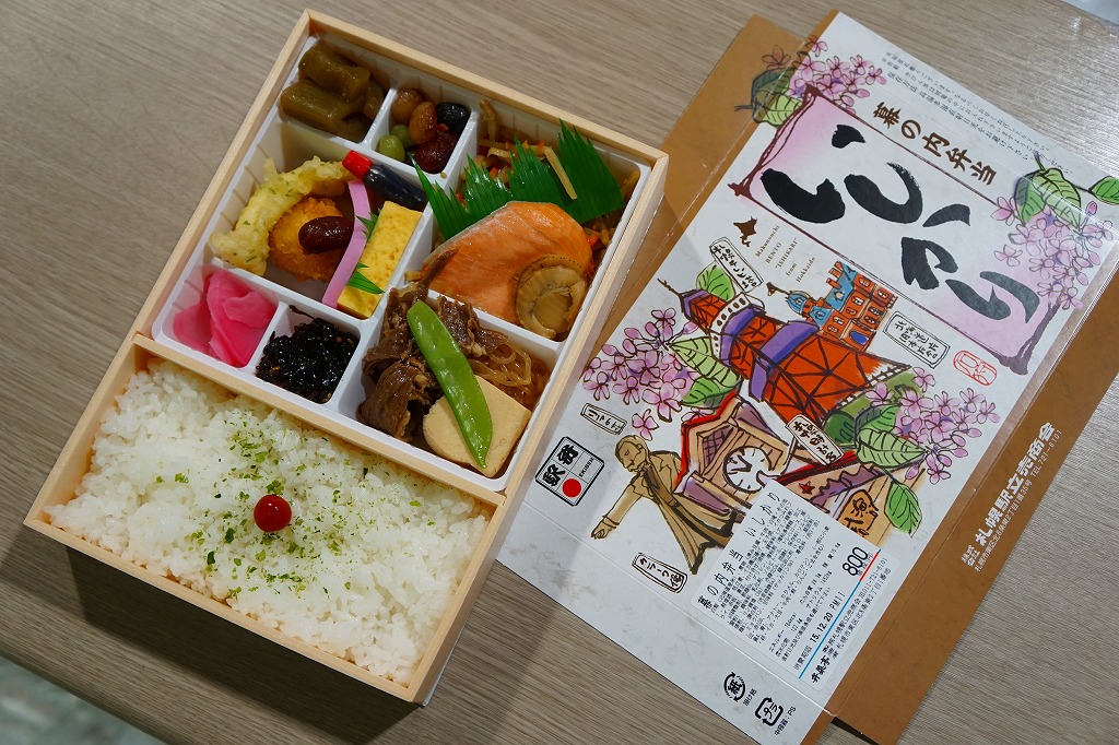 その名のとおり、札幌駅の幕の内弁当であり、札幌駅で唯一の幕の内駅弁。パッケージには札幌の観光名所がいろいろ賑やかに描かれる。中身は日の丸御飯、鮭塩焼、かまぼこ、玉子焼、牛肉煮、ホタテ煮、きんぴらごぼう、イカ磯部揚とイカつみれフライ、煮豆、佃煮、大根桜漬など。イカやホタテで北海道かもしれないが、札幌らしさや北海道らしさのないことが特長だと思う、普通の駅弁。価格は2015年の購入時で800円、2019年時点で850円、2023年時点で900円、2024年時点で1,050円、11月から1,100円。