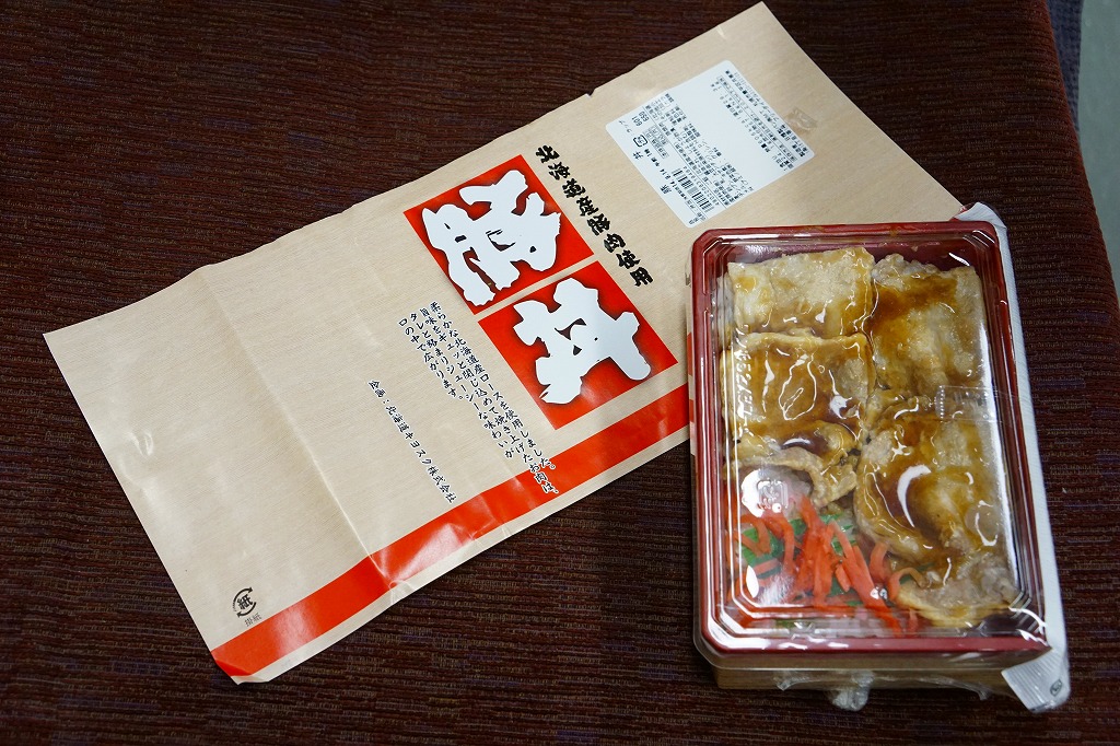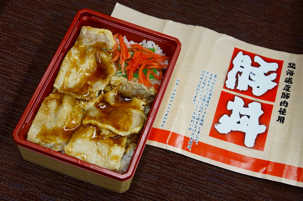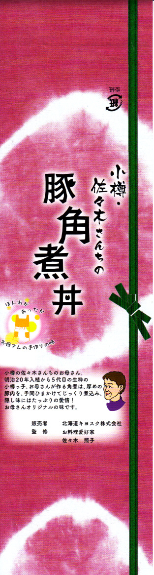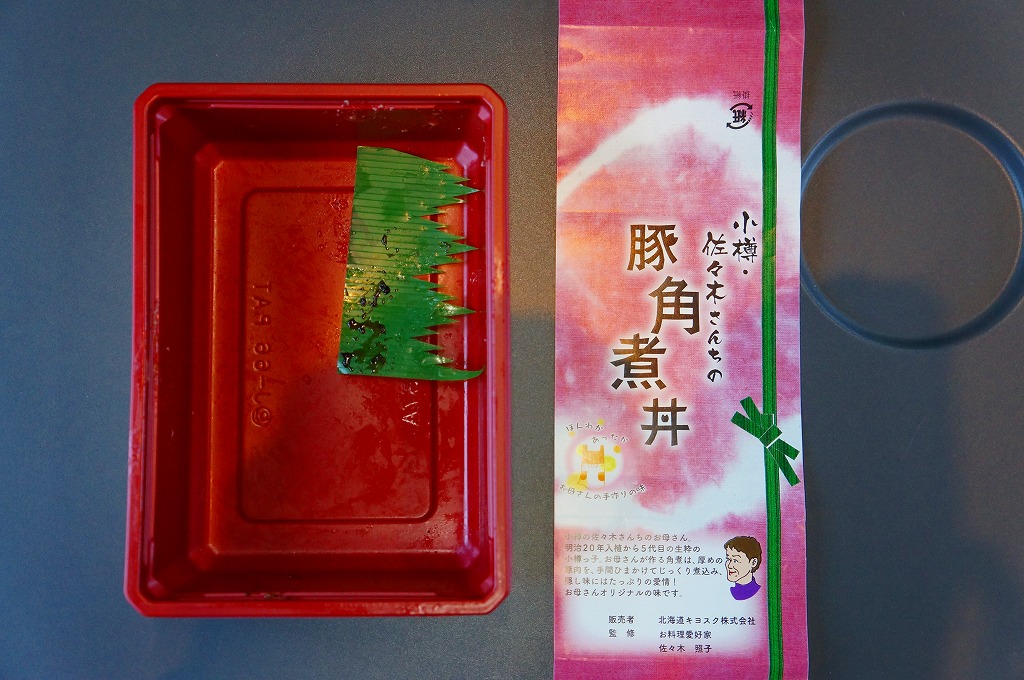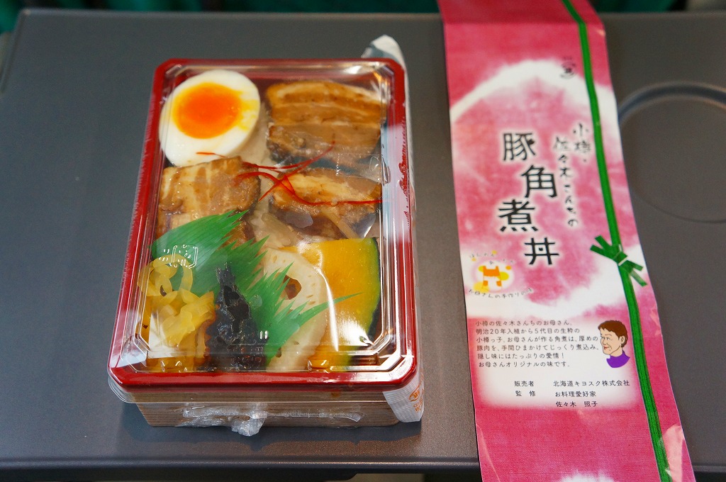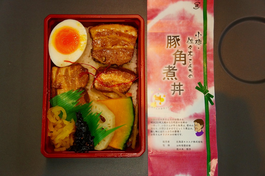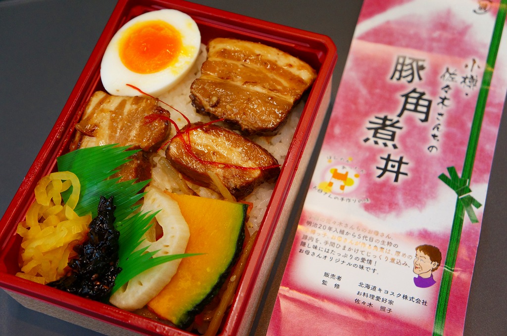 2012(平成24)年の発売か。札幌駅ほか道内各地の駅弁売店でなくキヨスクで売られる、駅弁のようなお弁当。白御飯を豚角煮3個、半身のゆで卵、カボチャ、れんこん、昆布佃煮、きんぴらごぼう、大根漬で覆う。まるで空弁のようにコンパクトかつ無臭で、豚角煮なのにスマートで控えめなお味。掛紙によると、1887(明治20)年入植から5代目の小樽っ子である、佐々木さんちのお母さんが作る角煮なのだそうだ。2015年頃までの販売か。
