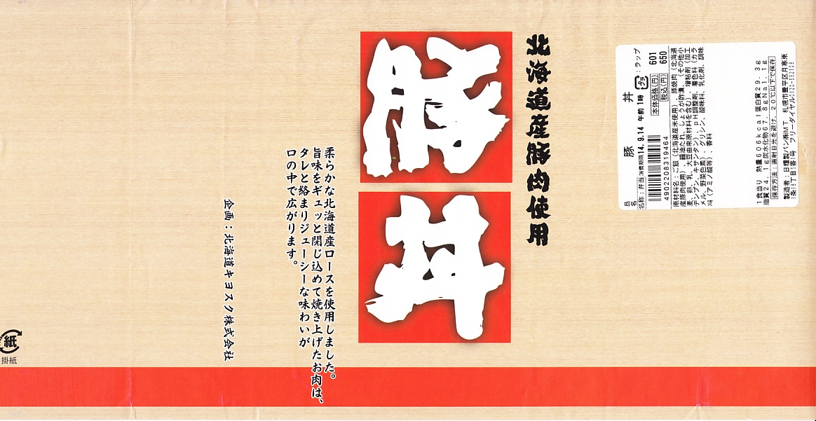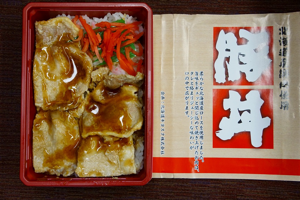 2014(平成26)年9月に旭川駅のキヨスクで買えたお弁当。同じものが札幌駅のキヨスクにもあった。長方形のプラ容器に白飯を詰めて豚焼肉で覆い、紅生姜を添えて商品名の掛紙を巻いたもの。肉もタレも本当にクセのない味は、スマートなお惣菜。