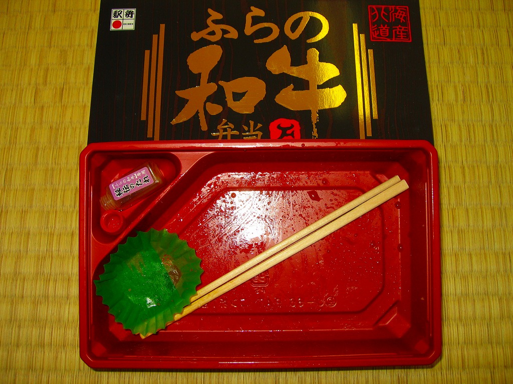 2008(平成20)年10月の発売は、2008〜2009年の駅弁大会シーズンに向けたものだろうか。トレーを接着した長方形の容器に透明なふたをして、家具のような木目柄に金色で駅弁の名前を描くボール紙の枠にはめる。中身は北海道米ななつぼしの白御飯の上に、富良野ワインで煮た「ふらの和牛」もも肉を置き、カマンベールチーズフライやカボチャにナガイモ揚やピーマンを貼り、牛肉しぐれ煮と赤カブとタレを添えるもの。