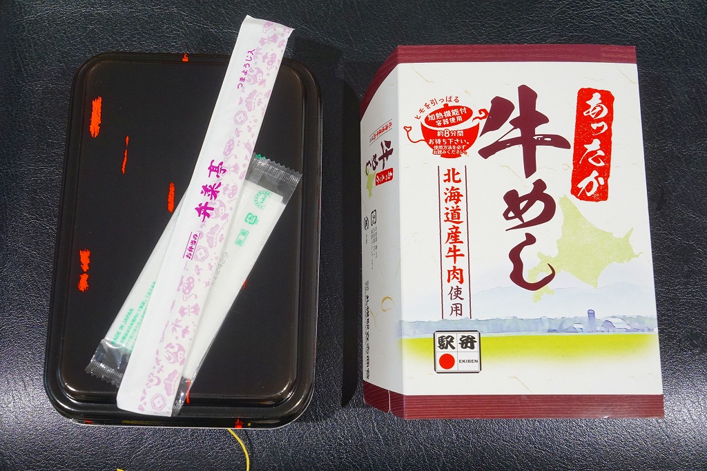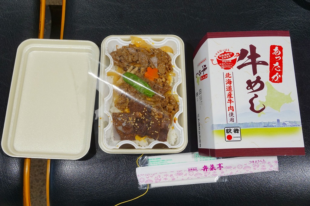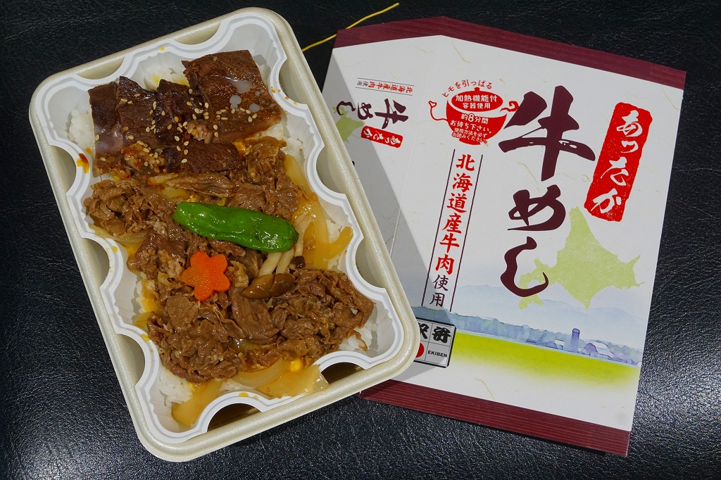 2016(平成28)年10月11日に「ジンギスカンあったか弁当」とともに発売。長方形の加熱機能付き容器に白飯を敷き、タマネギ炒めで覆い、牛肉煮と牛焼肉を載せ、シメジ、ニンジン、ししとうで彩る。昔の北海道では肉の駅弁が珍しかったというが、今はこうして普通に売っている。本州の牛肉駅弁と同じような味がする。冬季のみ販売。価格は2016年の発売時や2018年の購入時で1,080円、2022年時点で1,100円。