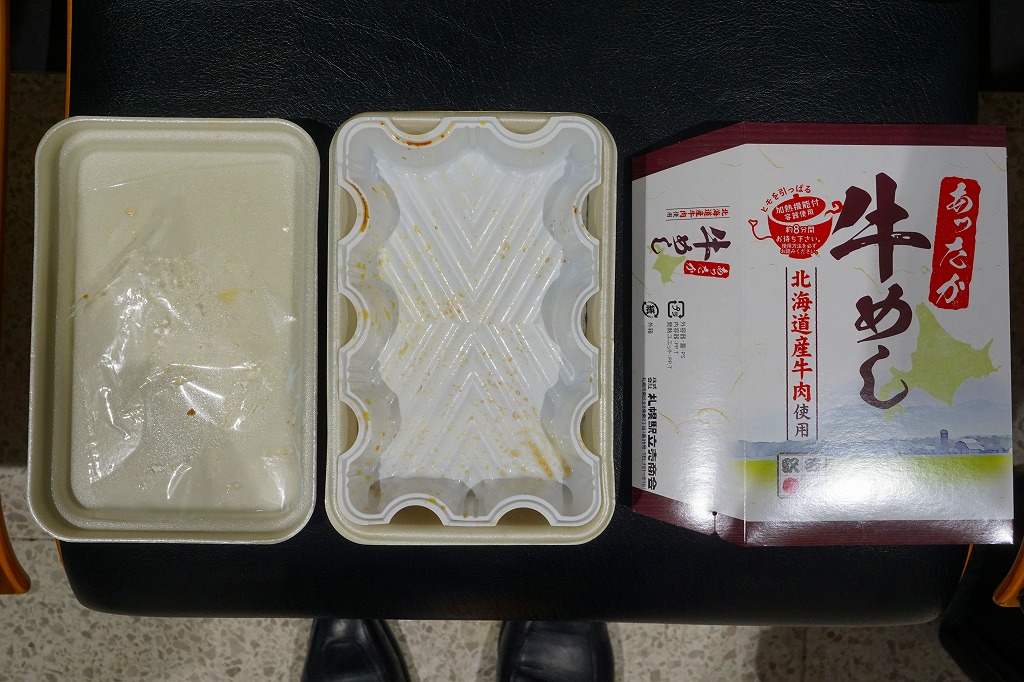 札幌駅の駅弁売店でなくキヨスクで買えた、駅弁のようなお弁当。白御飯を牛焼肉とタマネギ炒めで覆い、グリーンピースで彩り、玉子焼と大根漬を添える。コンビニ弁当や惣菜弁当のたぐいだろうが、見栄えも中身も駅弁の王道を行く。冷蔵の味もそんなに悪くない。これで575円だから、駅弁と考えれば格安。