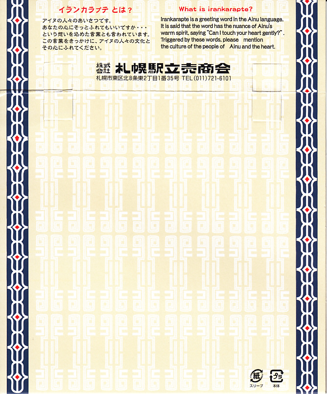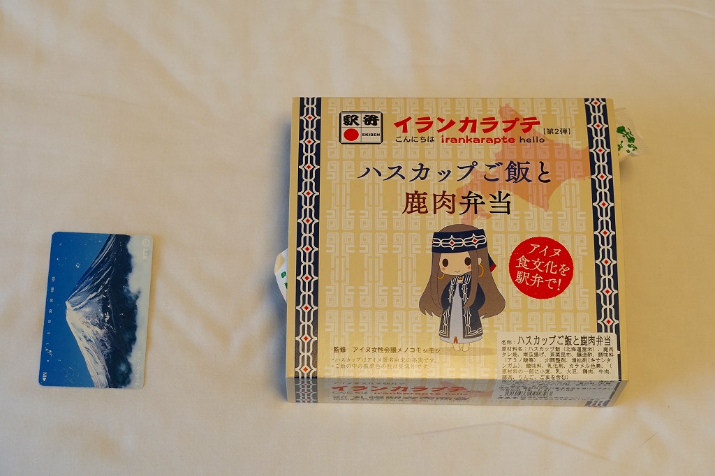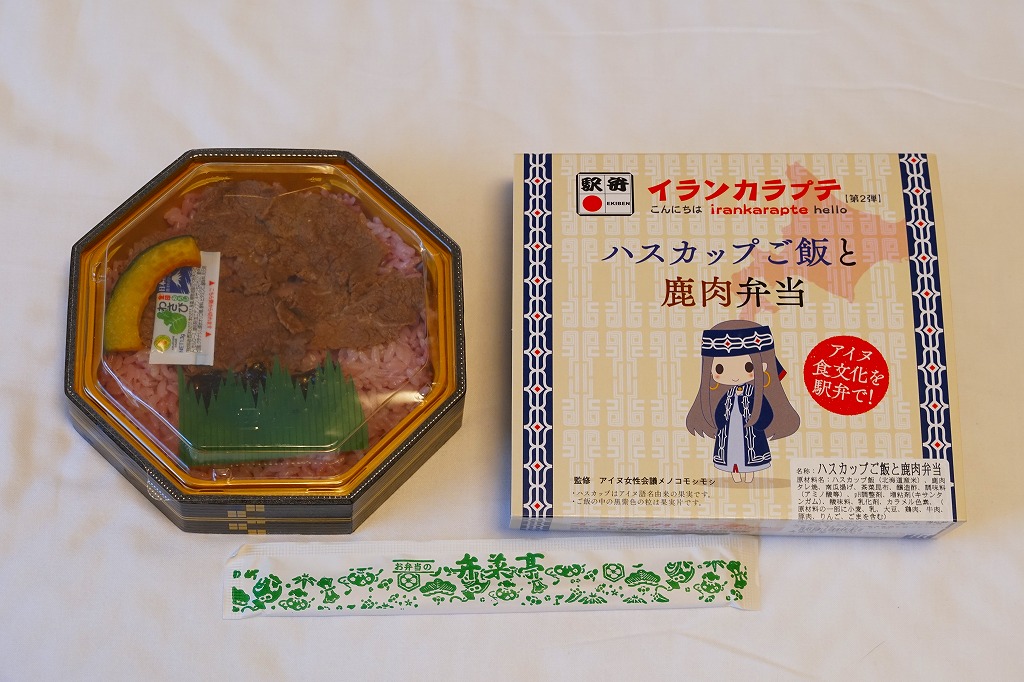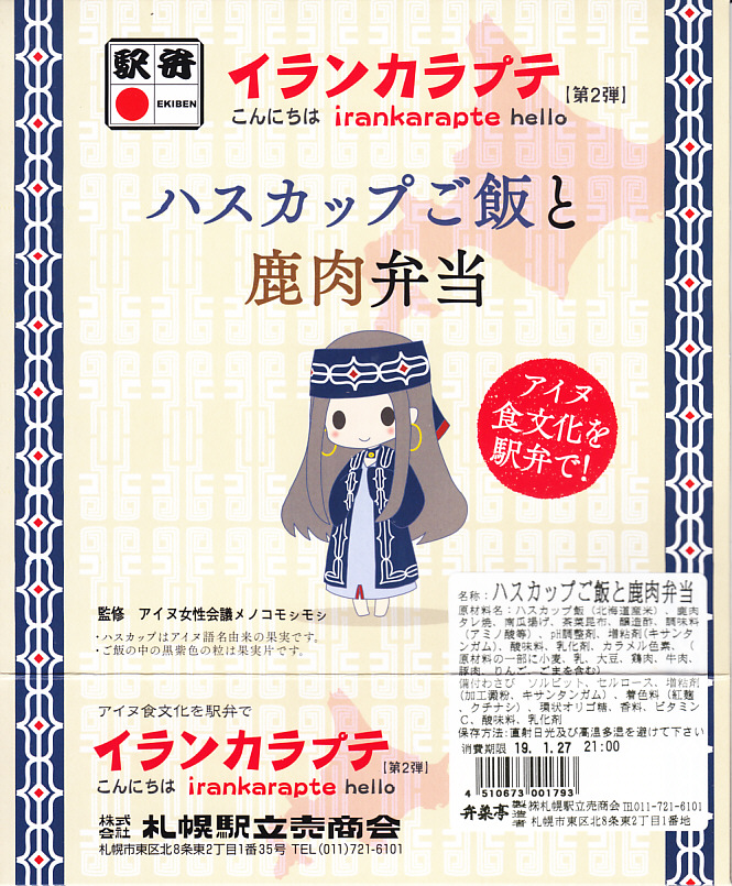 北海道命名150年事業応援企画として2018(平成30)年4月10日に発売したものに次ぐ、札幌駅のイランカラプテ駅弁の第2弾として、2018(平成30)年9月20日に発売。「イランカラプテ」とは、アイヌ語で「こんにちは」の意味。今回は「ハスカップご飯と鹿肉弁当」の副題が付き、その名のとおりハスカップの実で染めた御飯を、鹿肉のタレ焼で覆い、昆布とカボチャを添えていた。そんな内容はアイヌ料理に由来するという。今回は大阪の駅弁催事での輸送販売だったためか、味がないうえに硬くなっており、おそらく本来の味をいただけなかったと思う。