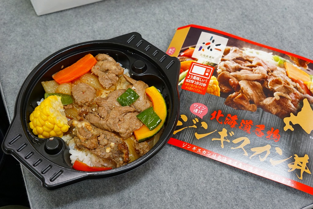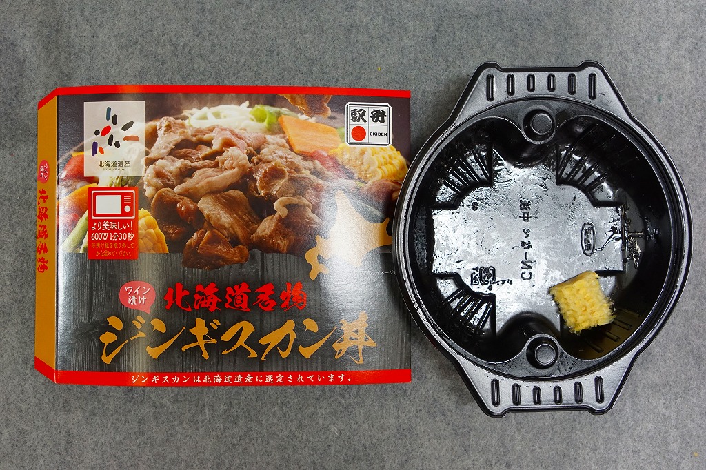 この商品は、デパートやスーパーの駅弁大会でのみ売られる疑義駅弁。購入時は調製元の公式サイトに商品の掲載があり、『※ジンギスカン丼は、駅弁大会オリジナルとなります。(札幌駅でのご利用時は、【ジンギスカンあったか弁当】をお買い求めください。』という注記があった。