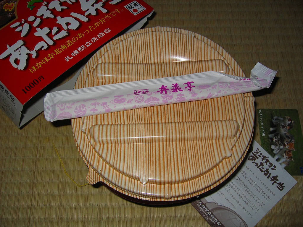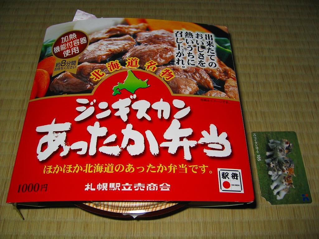 1997(平成9)年に発売。円形の加熱機能付き容器を、中身の写真を美しく載せたボール紙のパッケージに入れる。中身は白御飯の上にラムロース肉を敷いてタマネギ・ニンジン・ピーマン・カボチャを置く。駅弁なので出来立てではないのに、ラム肉に臭みも固さもないなど、札幌のビール園で観光名物となるジンギスカンの風味がよく再現されていると思う。価格は2005年の購入時で1,000円、2013年時点で850円、2016年時点で再び1,000円、2022年時点で1,100円。冬季限定発売と思われる。