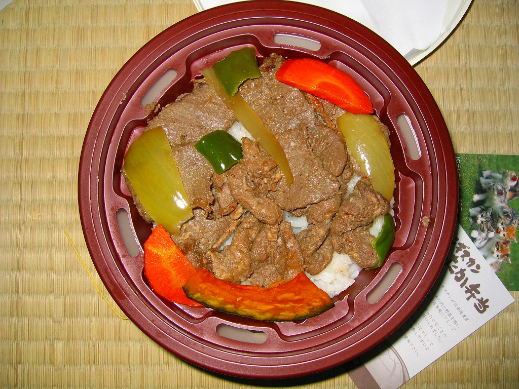 2003(平成15)年5月に発売。前年10月に旅情報誌「じゃらん」北海道版で特集された9〜12月発売「短角牛弁当」のレギュラー入りらしい。赤いトレーを正方形のボール紙容器に収める。中身は北海道米ほしのゆめの御飯に、札幌産のタマネギと宗谷産の黒牛肉を載せ、日高産の昆布入り玉子焼など。パッケージの食べられてしまう牛が喜ぶイラストは、豚や鶏ではよく見るが牛では珍しいと思う。価格の「特別定価」とは何だろう。2013年時点で販売されていない。