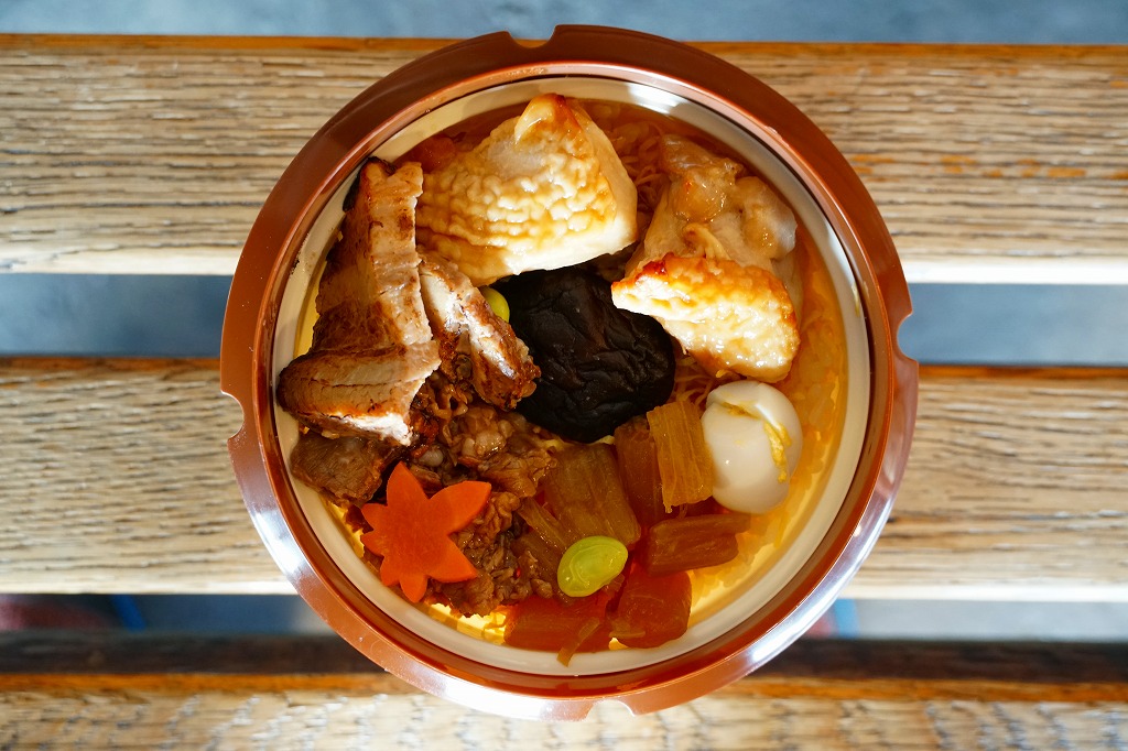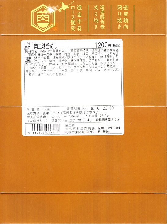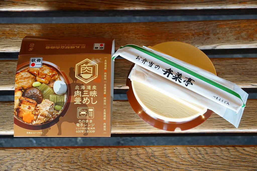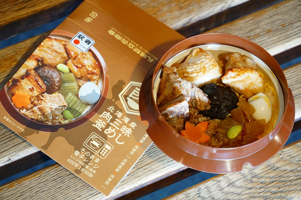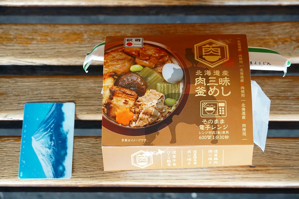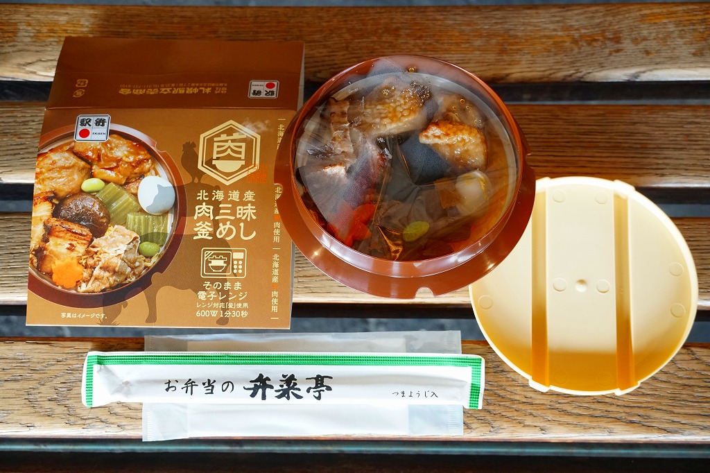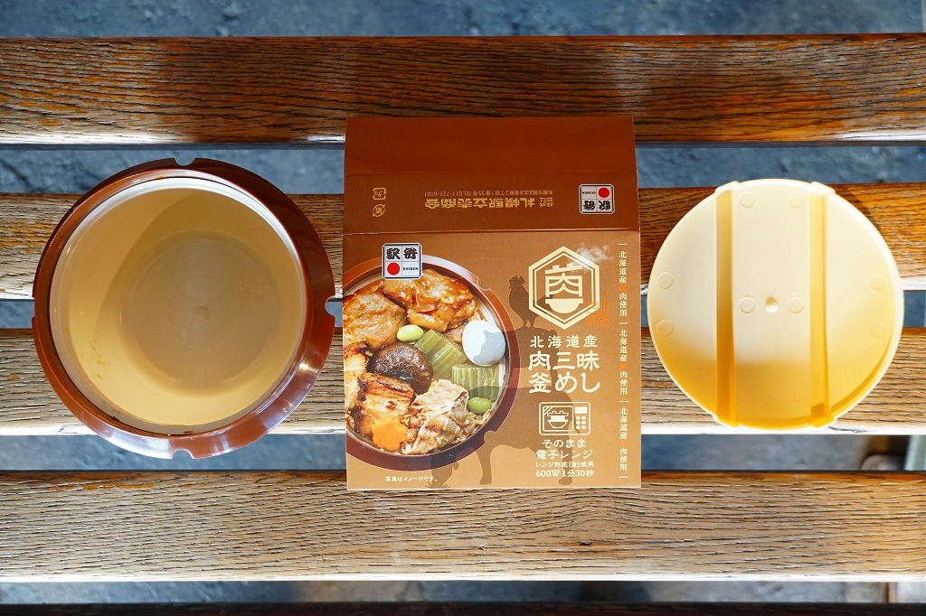 2021(令和3)年9月に札幌駅で発売。商品名と中身の写真を描いたスリーブに収める、各地の釜飯駅弁でも使われるプラ製の釜型容器に、茶飯を詰め、道産鶏照焼、道産豚角煮の炙り焼き、道産牛肩ロース煮、しいたけ、にんじん、うずら卵、ふきなどで覆う。肉三昧ほどの分量がなくても、牛豚鶏でちゃんと3種類のお肉を使う、釜飯タイプの駅弁。それらの肉が大粒なので、このサイズを超えて豪快な印象を受けた。