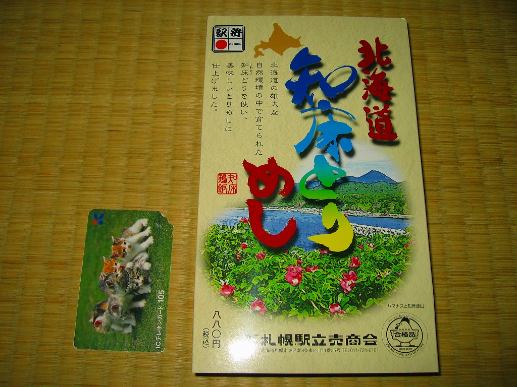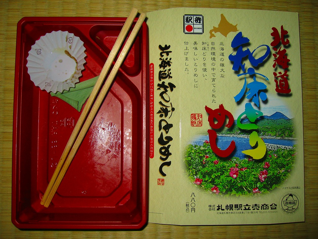 しかし、札幌から知床までは直線距離でも約300km、都市間バスで7時間以上かかり、夜行便が出るほど遠いのに、札幌駅で知床を名乗る駅弁が売られるとは驚いた。価格は2009年の購入時で880円、2016年時点で900円。