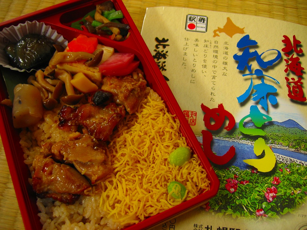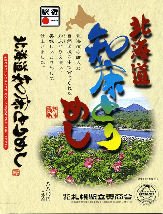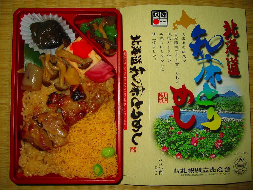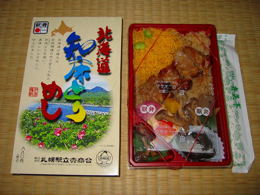 2008(平成20)年4月に発売か。トレーを接着した長方形の容器に透明なふたをして輪ゴムでしばり、駅弁の名前と知床の風景画を描いたボール紙の枠にはめる。中身は鶏肉とゴボウを混ぜた味付飯の上に「知床どり」の照焼、錦糸卵、シメジ、鮭カマボコなどを置き、ナス煮浸やヤマブキ煮などを添えるもの鶏肉は焼き鳥1本分だけなので見た目に不足するが、御飯の味付けで十分にカバーされている。