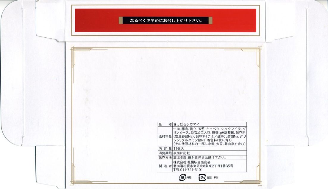 札幌駅に昔からいたのではないかと思う駅売り焼売。楊枝ではなく割りばしを入れた赤いボール紙の箱に、プラ製の惣菜容器に敷き並べた11個の焼売が収まる。横浜駅や鳥栖駅のものとは違い、博多駅のものに似ている、スーパーでのチルド商品と同じように柔らかい、しかし常温でも食べて大丈夫な普通の焼売。残念ながら、2014年時点で終売とされる。