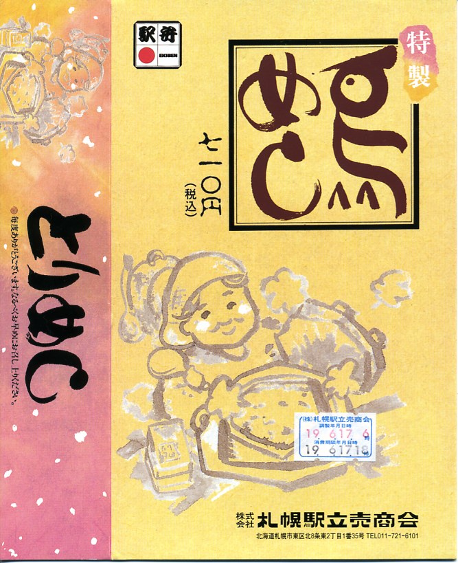 2014(平成26)年1月2日に購入した、札幌駅弁の掛紙。上記の2018年のものと違い、当時の掛け紙は白く、容器の内側は赤かった。中身は同じ。