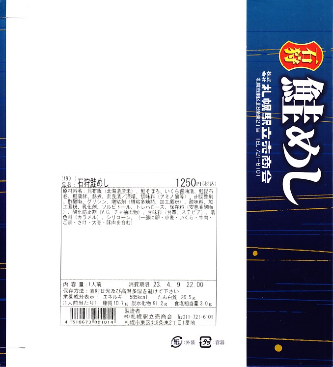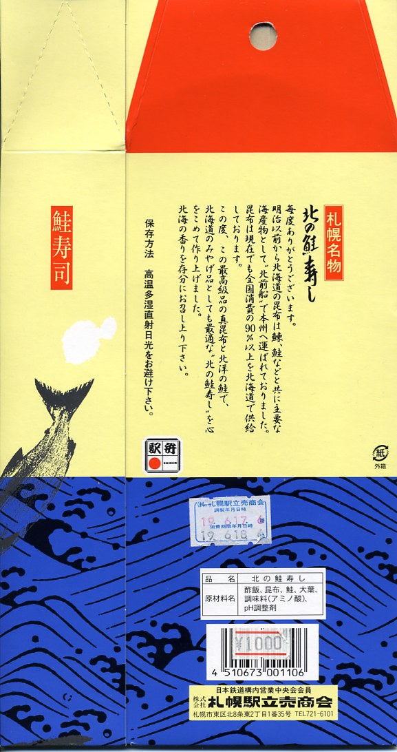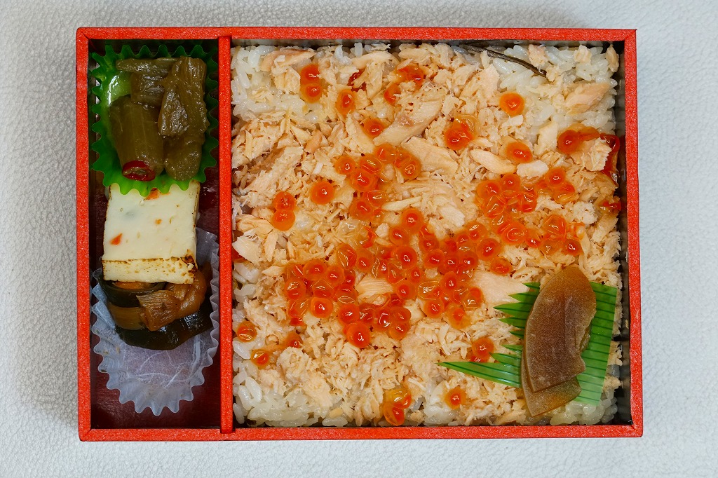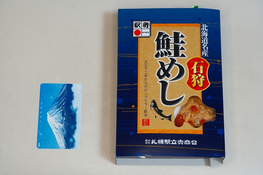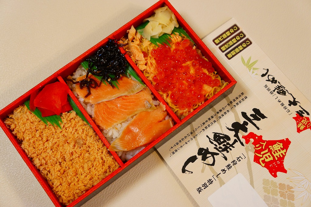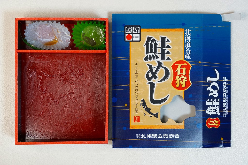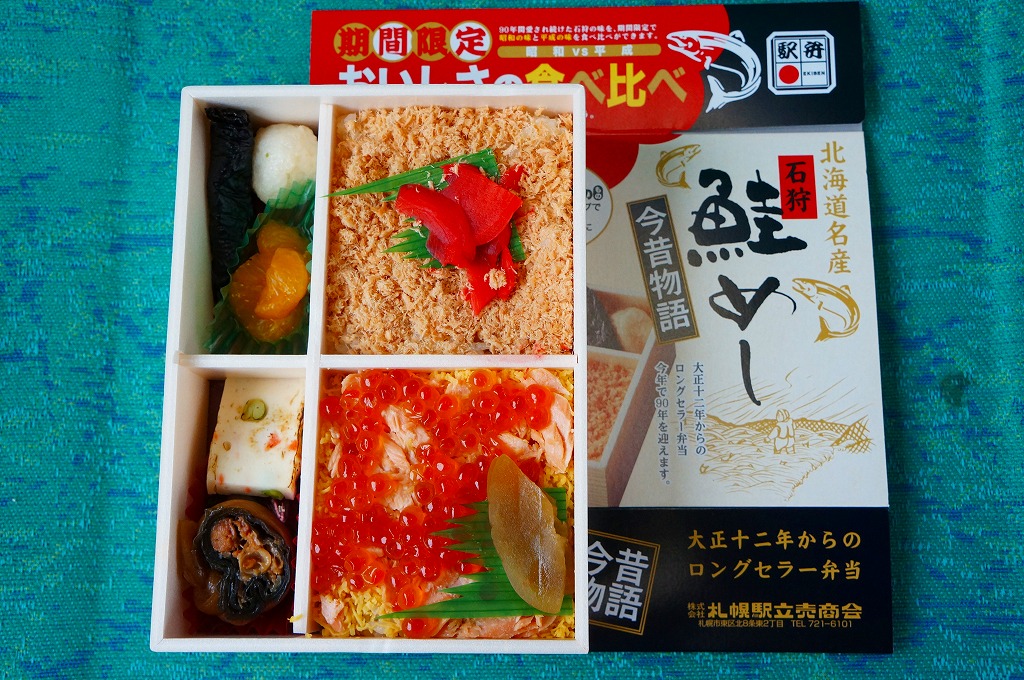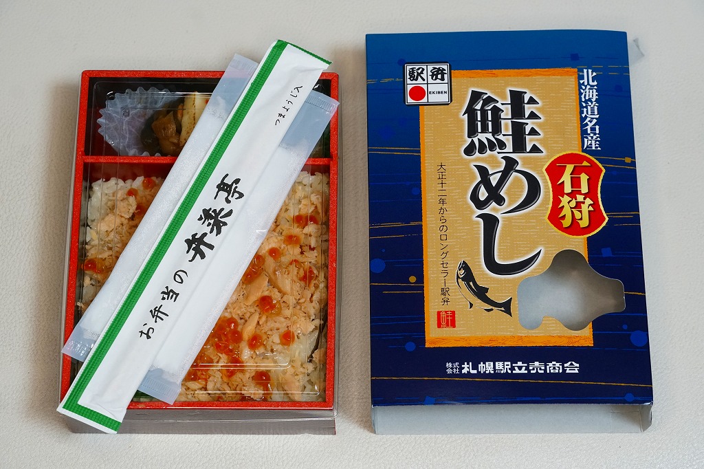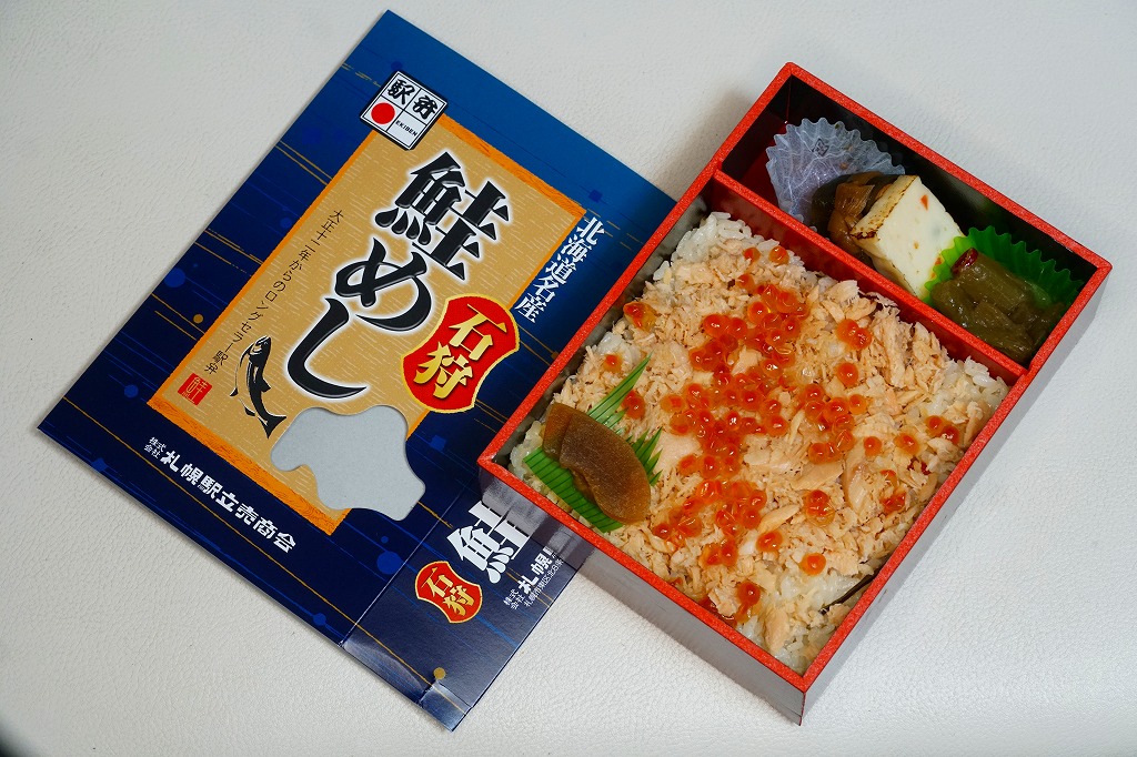 1923(大正12)年に札幌駅で発売されたロングセラー。幕の内弁当でも助六寿司でもない駅弁「特殊弁当」では、北海道で初めてのものだという。2014年までには使われるようになったこの青いスリーブには発売年を記し、商品名を記して中身を少しだけ見せる。中身は昆布飯を鮭そぼろとイクラ醤油漬で覆い、奈良漬、鮭昆布巻、鮭蒲鉾、ふき煮を添えるもの。鮭以外の内容はよく変わるようで、茶飯や鮭飯だったり、イクラを散らしたり固めたり、錦糸卵や枝豆を載せたり、鮭でない付合せだったりするらしい。価格は2004年時点で1,000円、2014年4月の消費税率改定で1,030円、2019年時点で1,150円、2023年時点で1,250円、2024年時点で1,300円、11月から1,350円。
