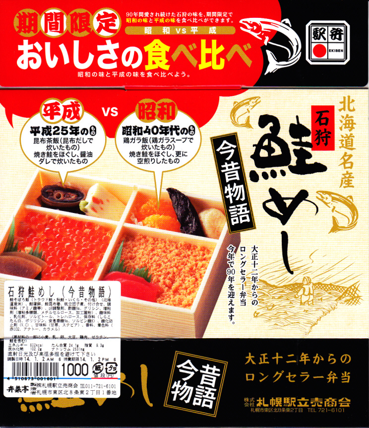 札幌駅で伝統の駅弁「石狩鮭めし」の発売90周年を記念して、2013(平成25)年9月から翌年3月まで販売。その名のとおり、そしてパッケージに写真付きで紹介されるとおり、今の平成25年の石狩鮭めしと、昔の昭和40年代の石狩鮭めしを、付合せを含め半分づつ詰めた。